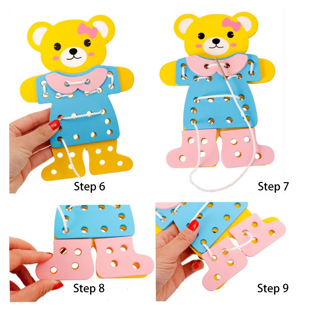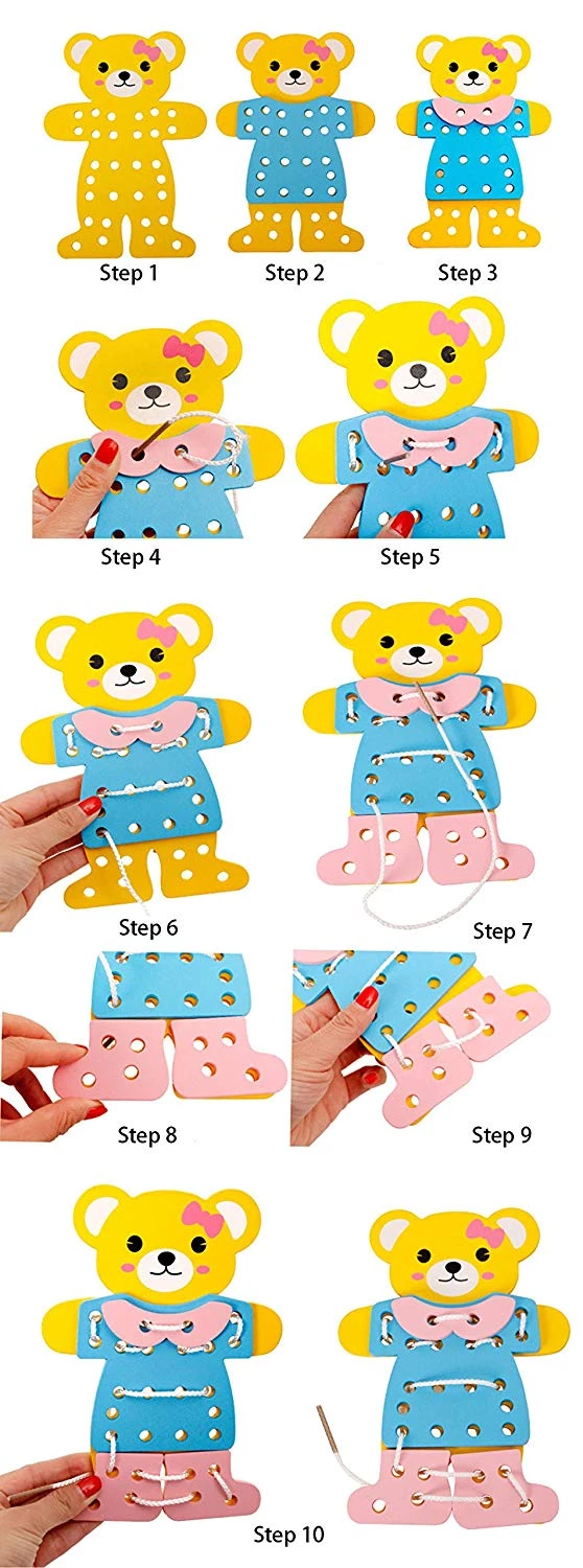 Є багато способів грати з іграшкою: можна обвести контур ведмедики на папері і приміряти йому наряди перед кріпленням на саму фігурку, а також можна комбінувати одяг в різних варіантах. Одяг як би пришивається до ведмедику за рахунок шнурків, які імітують справжню голку й нитку. Можна попросити дитину по черзі називати частини тіла й елементи одягу і взуття.