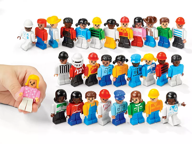 Від поліцейського і пожежного до гонщика і футболіста, тут досить різноманітних людей, щоб створити ціле містечко! 30 різних фігурок мають рухаючі руки, ноги і голови... плюс змінні шапки, шоломи і волосся. Кожна фігура заввишки 4 см.