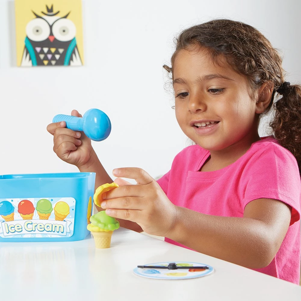 Цей набір, схожий на справжню коробку морозива, спонукає дітей збирати яскраві різнокольорові кульки з зображенням морозива в барвисті миски для морозива.
