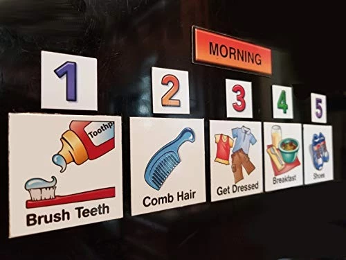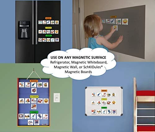 72 магніта із зображенням предметів домашнього вжитку, шкільних предметів, а також 21 магніт з заголовками, щоб діти могли скласти візуальний графік.