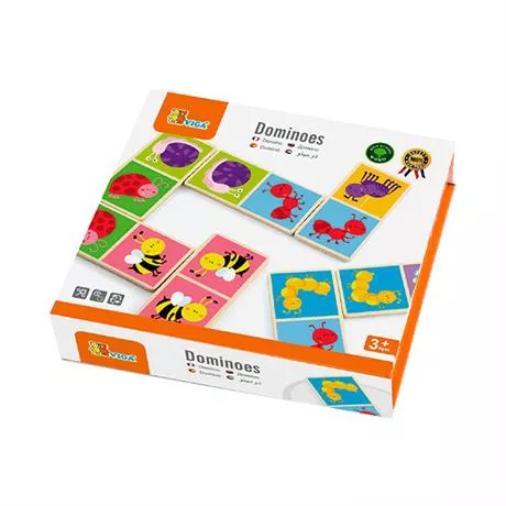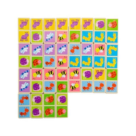 Набір дерев'яного доміно з яскравими картинками комах надовго захопить дитину. Потрібно складати пари з однакових картинок на фігурках доміно. Виграє той, хто першим використовує всі свої кісточки доміно