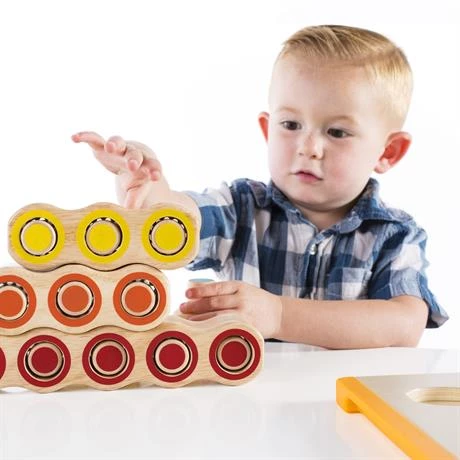 З цим набором діти тренують свої навички підрахунку, розпізнавання кольорів і сортування за допомогою різнокольорових циліндрів. Дошка-підставка з ручками виготовлена з каучукового дерева з невеликими пластиковими прокладками в порожнинах гілок. Їх можна складати горизонтально або вертикально.