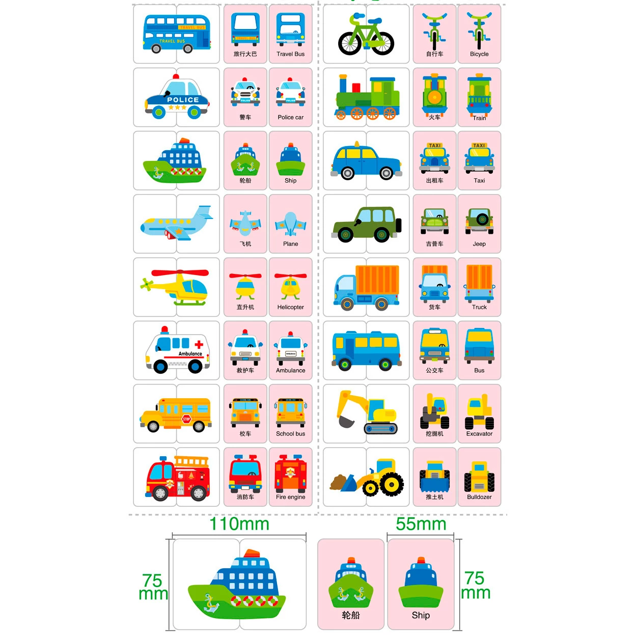 В даному наборі зображені різні види транспорту, повітряний, водний і наземний, до кожного окремого зображення йде дві картки, з одного боку це пазл з двох частин, з іншого боку зображено як транспорт виглядає спереду і з зади, напис англійською та китайською мовами.