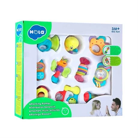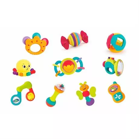 10 яскравих брязкалець (кільце, цукерка, телефон, труба, кулька, бабка, гантель, нота, восьминіг, кулька з кільцями) допоможуть дитині самостійно розвивати здатність до вивчення навколишнього світу. Якщо потрясти брязкальця, вони видадуть різні звуки, розвиваючи слухове сприйняття. Різнокольорові смужки і кульки стимулюють візуальне сприйняття і допоможуть розрізняти кольори. Брязкальця можна трясти, здавлювати або скручувати.