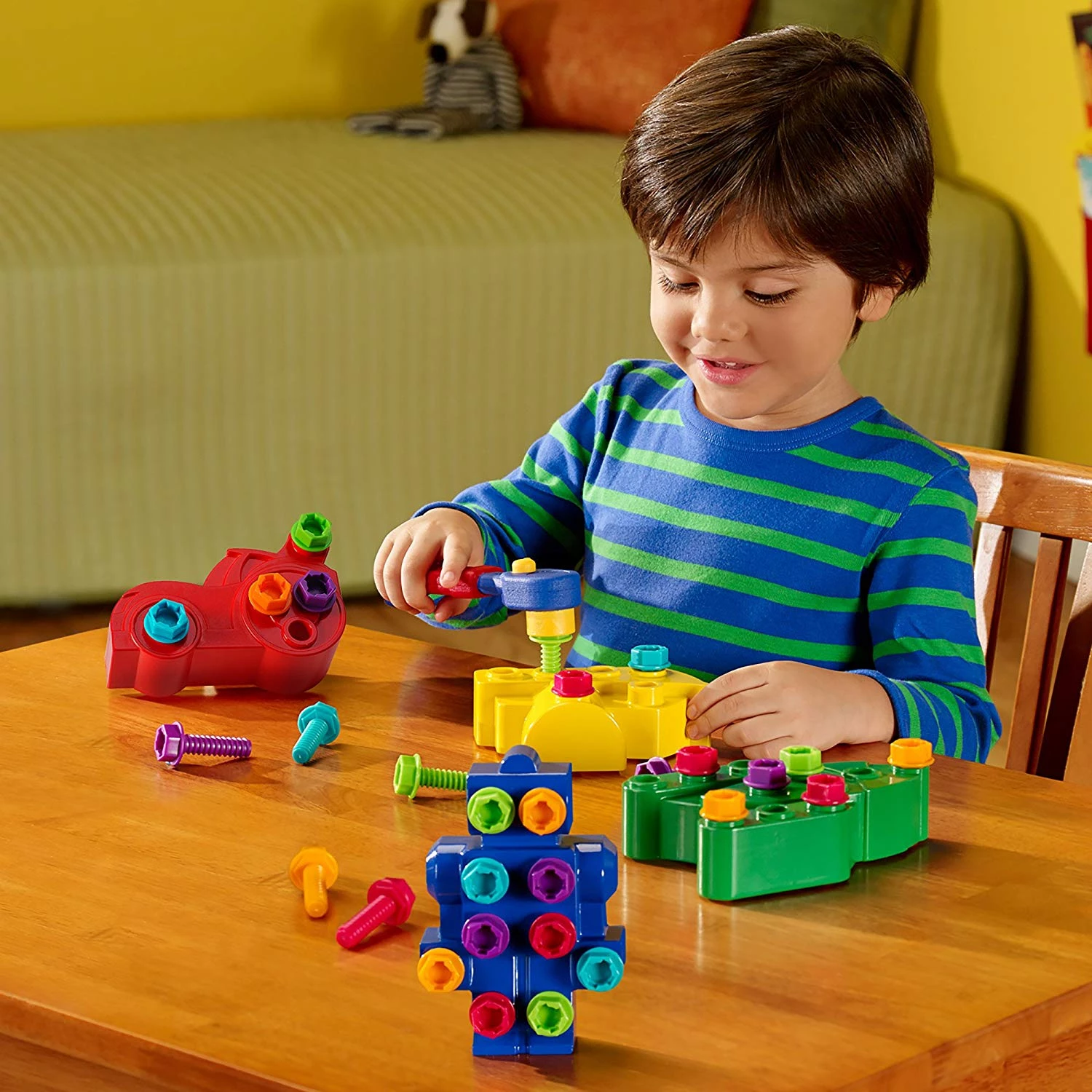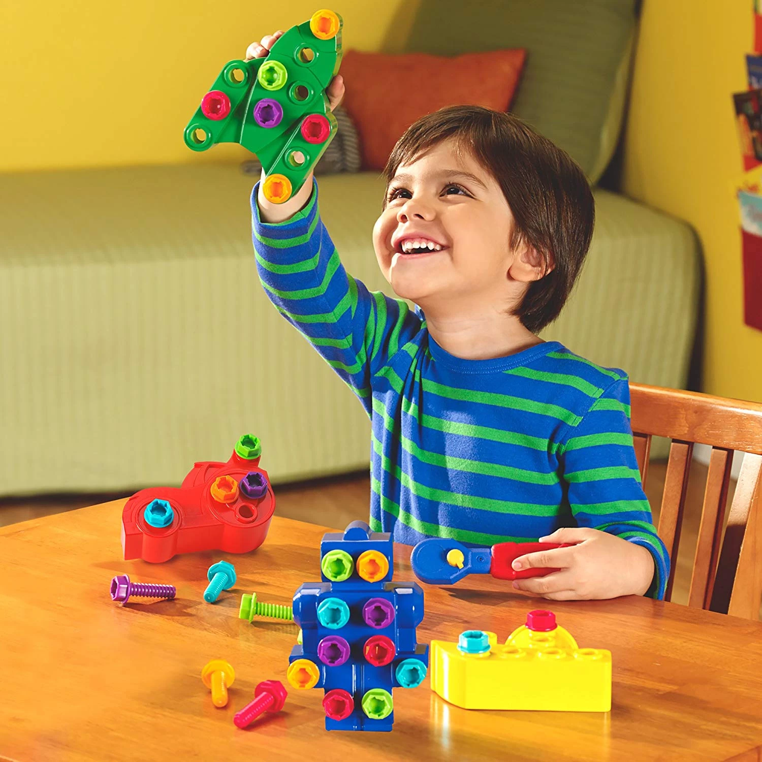 Використовуйте робочий, зручний для малюків торцевої гайковий ключ і міцні болти, щоб спроектувати човен, робот, гоночний автомобіль або ракету, а потім зіграйте з барвистою іграшкою! Коли закінчите гру, зніміть болти і почніть знову - це весела креативна гра для дошкільнят!