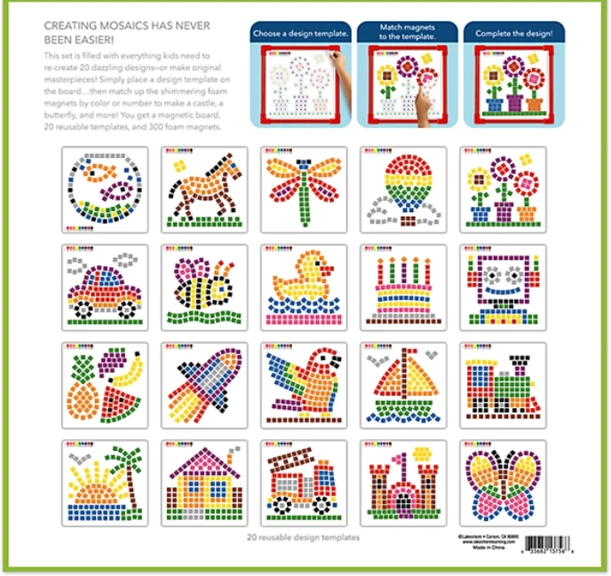З цим набором навіть малюки можуть створювати приголомшливі картинки з мозаїки! Можна збирати картинки по шаблонах або вигадувати свої картинки! Діти просто поміщають один із шаблонів на дошку, потім з'єднують мерехтливі магнітні плитки мозаїки з відповідними номерами, щоб створювати картинки замку, метелика та інші!