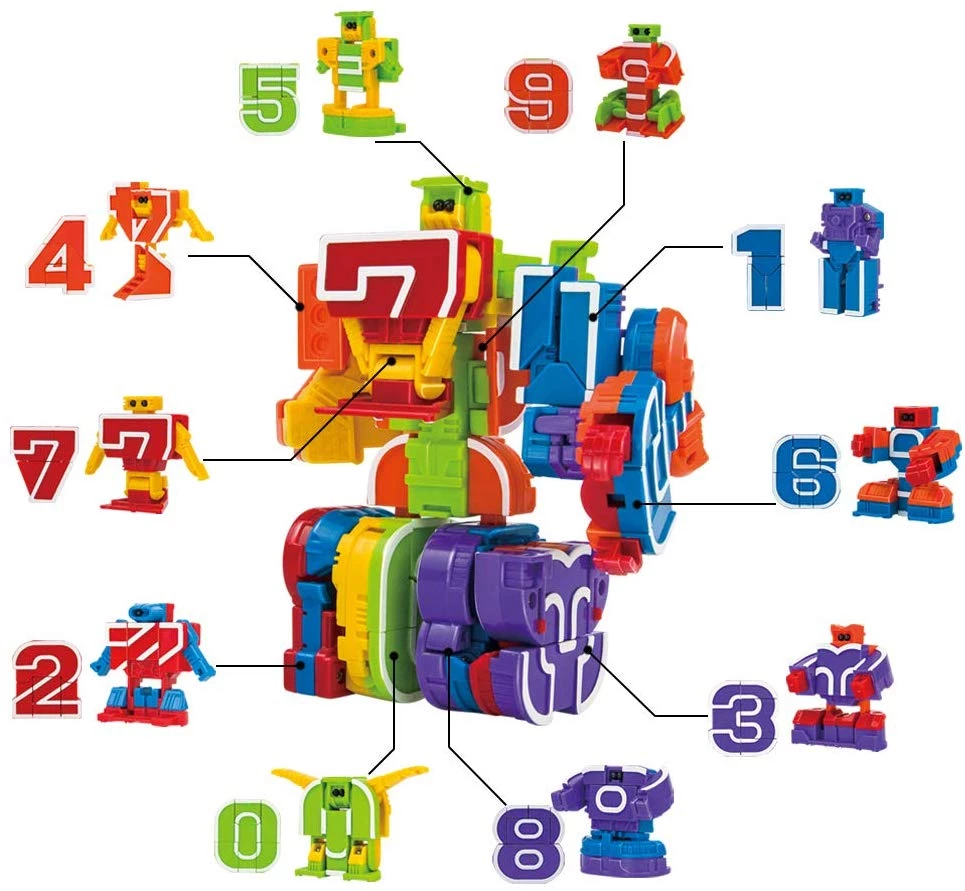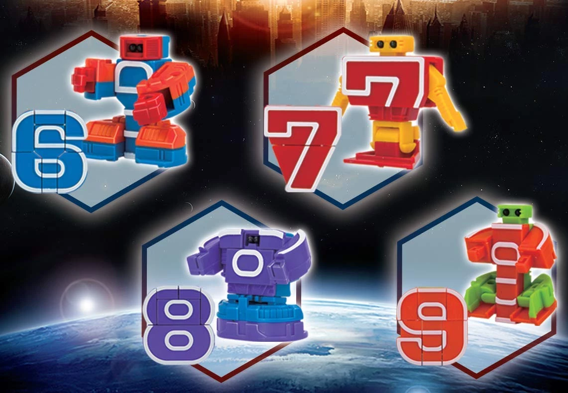 Прекрасные цифры роботы легко трансформируются. Моему сыночку легко удалось самому понять как это сделать. Каждая цифра трансформируется в отдельного маленького робота и потом этих маленьких роботов можно трансформировать в одного большого робота. Идеальная игрушка помогла мне надолго увлечь ребенка и научить его счету. Прекрасно развивает логику и мелкую моторику.