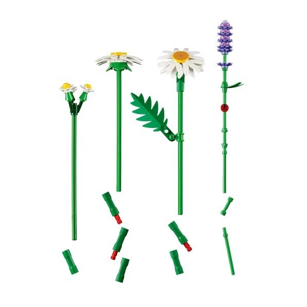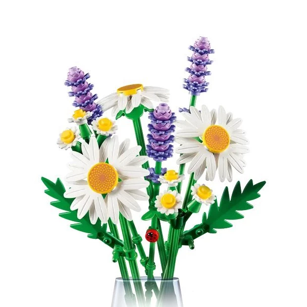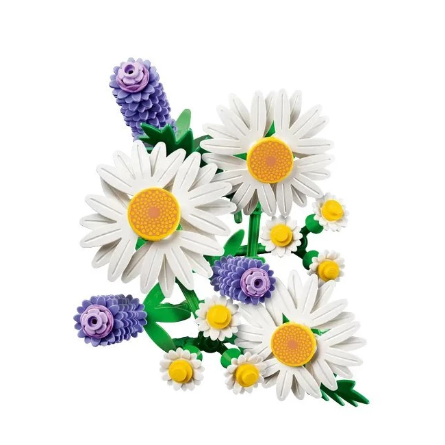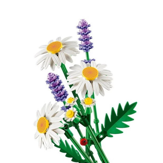 Цей чарівний набір для конструювання LEGO Botanicals дозволяє зібрати яскравий букет з трьох великих ромашок, двох витончених менших суцвіть і трьох пухнастих гілочок лаванди. Уважні будівельники знайдуть на одному із зелених стебел крихітне сонечко, яке обов'язково принесе удачу своєму власнику. Набір ідеально підходить для дітей віком від 9 років.