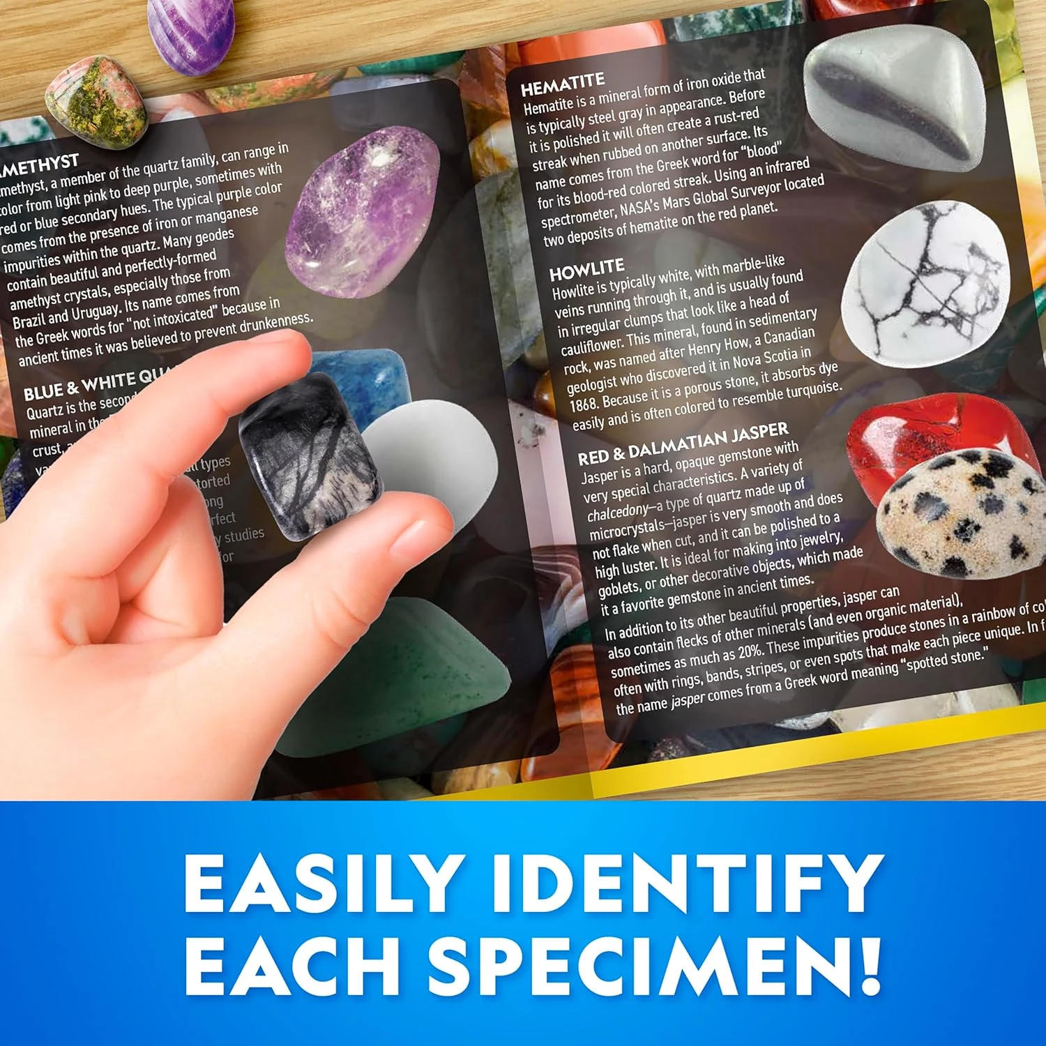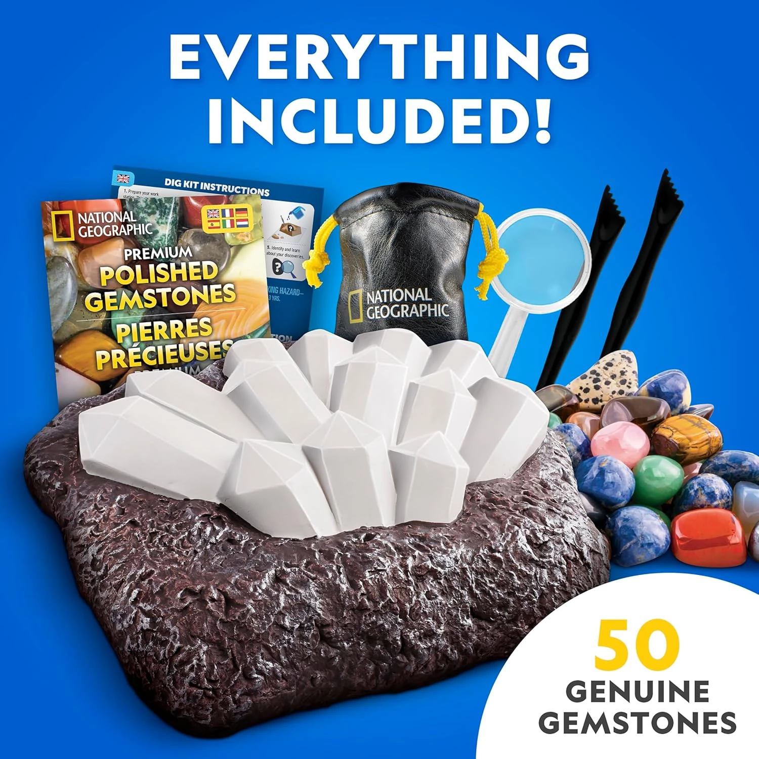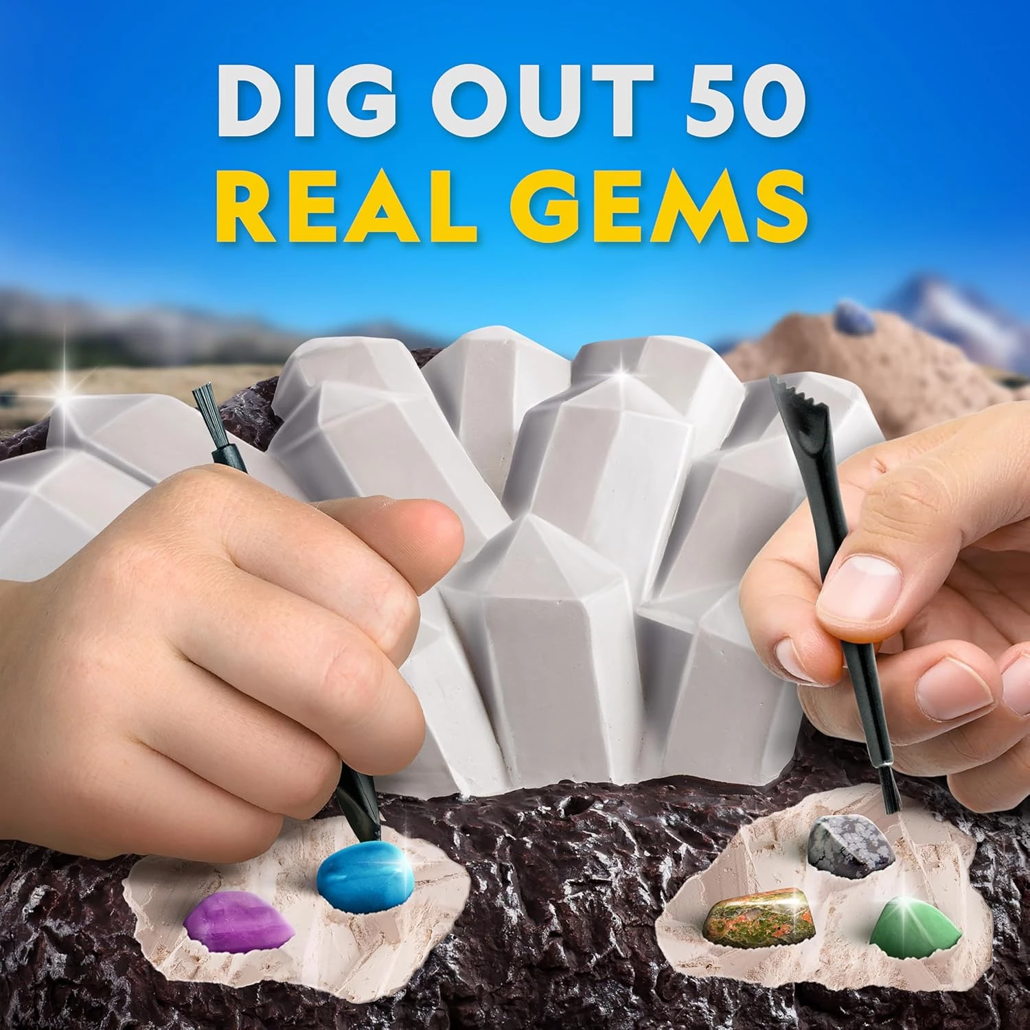 Даний набір для розкопок – це більше, ніж просто черговий ігровий набір, – це захоплива практична наукова пригода для дітей, які люблять каміння, кристали та відкриття. Велика цегла для розкопок містить 50 справжніх дорогоцінних каменів з усього світу, готових до видобутку за допомогою набору інструментів, що входить до комплекту. Розкопуйте чудові зразки, такі як аметист, рожевий кварц, тигрове око та інші, а потім за допомогою кольорового посібника дізнавайтеся цікаву інформацію про кожного з них.