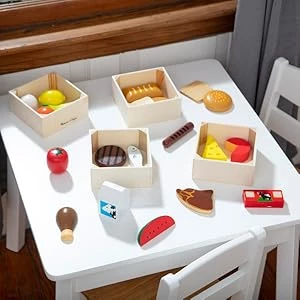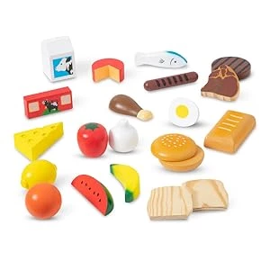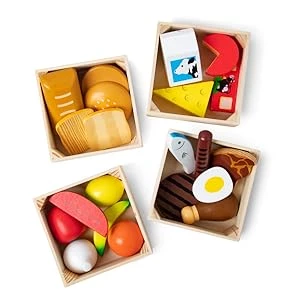 Цей веселий та пізнавальний набір для ігор з їжею познайомить дитину з основами правильного харчування та може бути використаний для раннього розвитку навичок рахунку, розпізнавання кольорів, сортування та групування. З цим дерев'яним набором їжі ваше чадо зможе дати волю своїй уяві. У комплект входить 21 предмет, розфарбований вручну. Вся іграшкова їжа, що входить у представлений набір, виготовлена з цільного дерева. Широкий вибір предметів включає сир, молоко, кавун, помідор, хліб, яйце, рибу, стейк та багато іншого. Іграшкова їжа постачається у чотирьох дерев'яних ящиках розміром 16 x 11 x 6,3 см. Це дозволяє сортувати їжу за групами: молочні продукти, фрукти та овочі, зернові, а також м'ясо та риба.