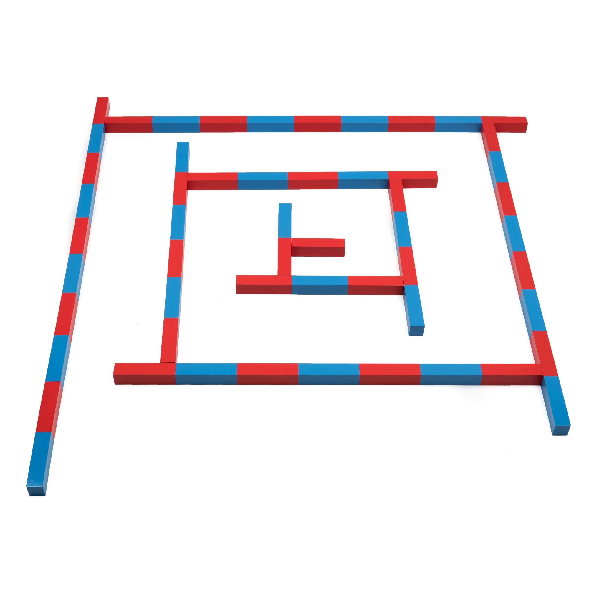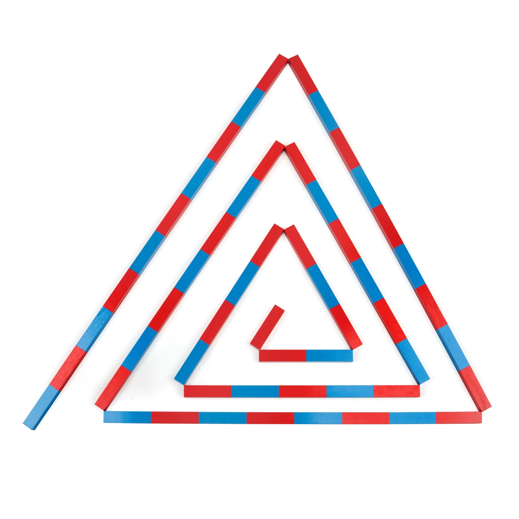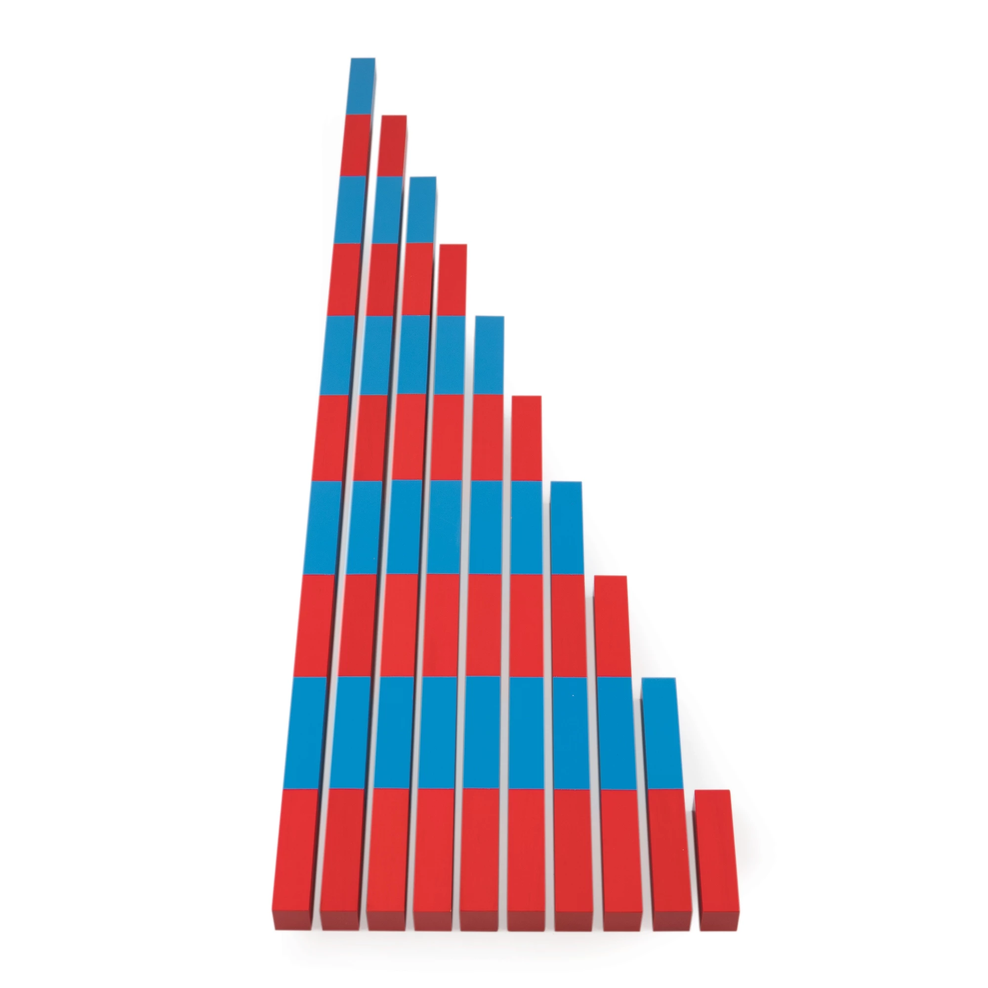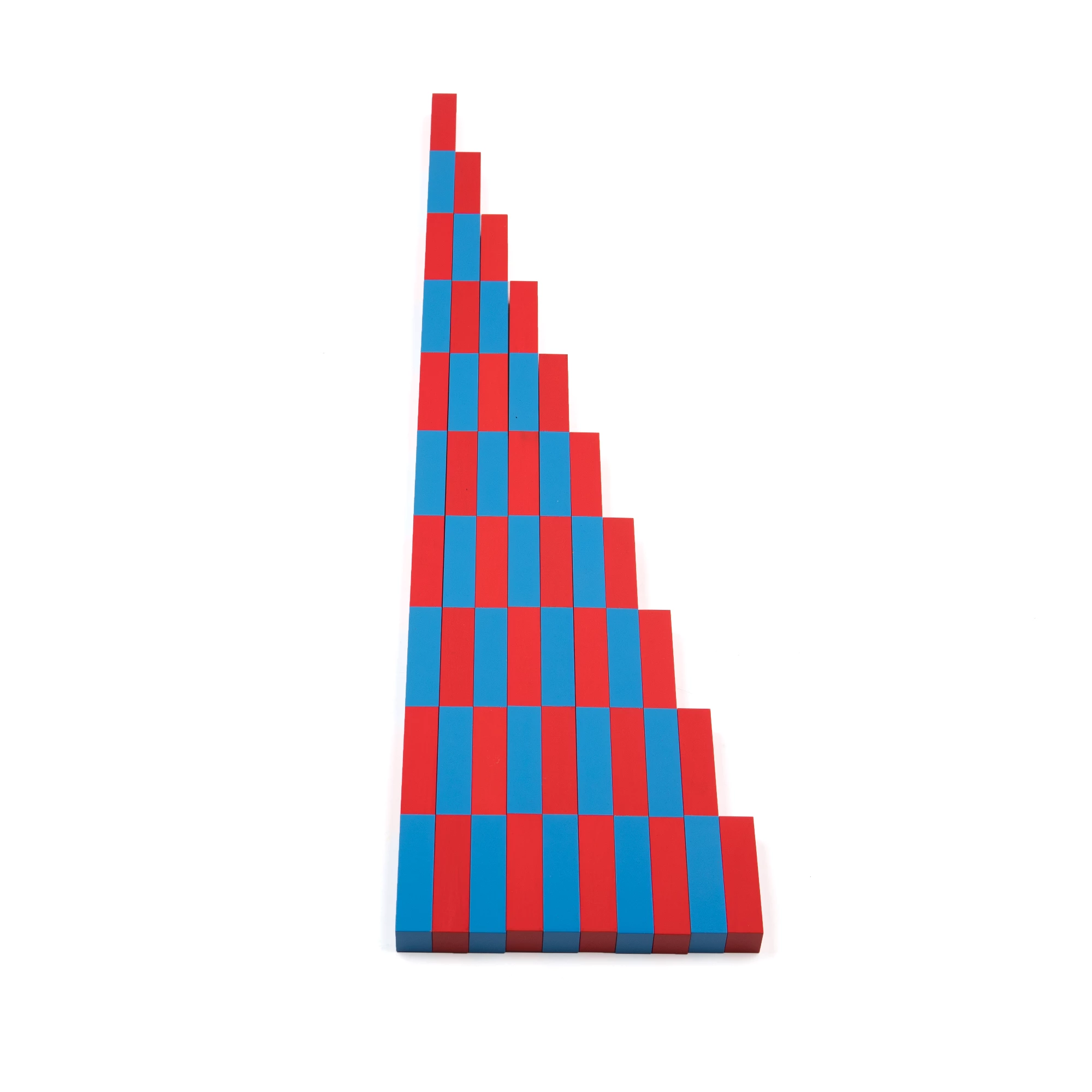 Дидактичний набір “Математичні штанги” включає 10 елементів, що за розмірами відповідають класичним червоним штангам. Відмінність полягає в тому, що кожна штанга поділена на червоні та блакитні відрізки довжиною по 10 см. Найкоротша складається з одного червоного сегмента.