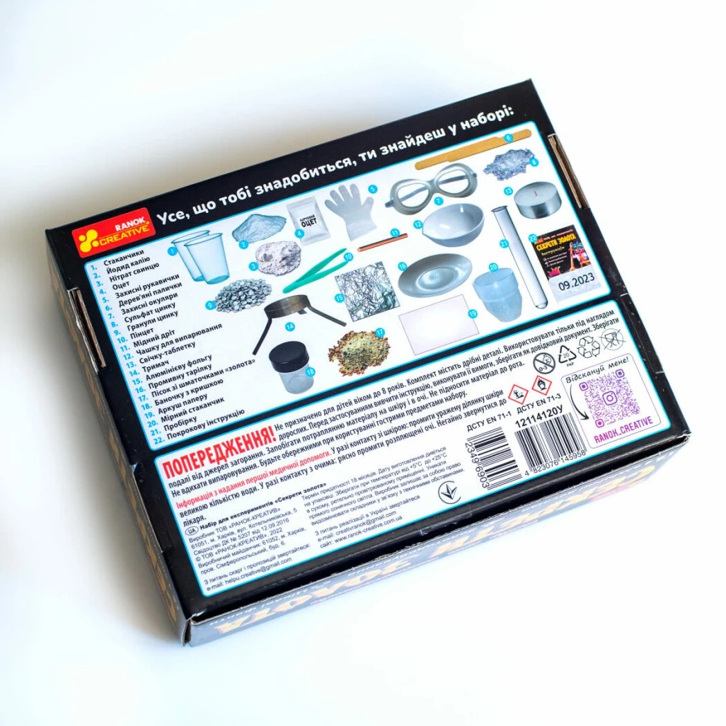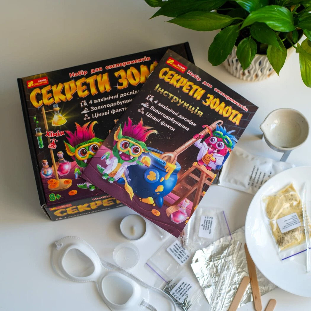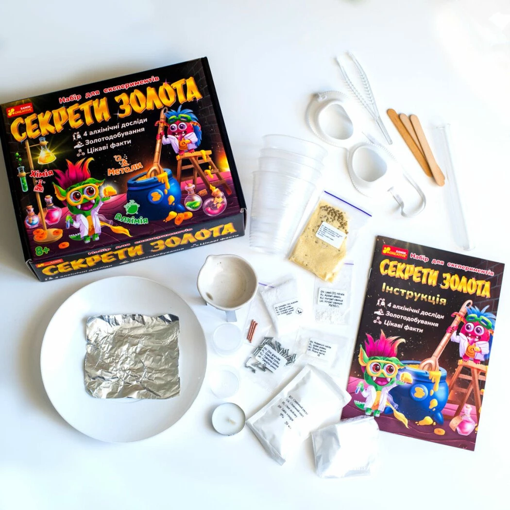 Відчуй себе справжнім алхіміком з набором «Секрети золота». Перетворюй звичайні предмети на золото. У цьому науковому наборі є все необхідне для експериментів, а також багато цікавих фактів про золото. «Відмивай золото» із простого піску, перетвори на золото мідь, зроби справжній зорепад. Цей набір стане чудовим подарунком для юних вчених та тих, хто любить відкривати наукові таємниці.