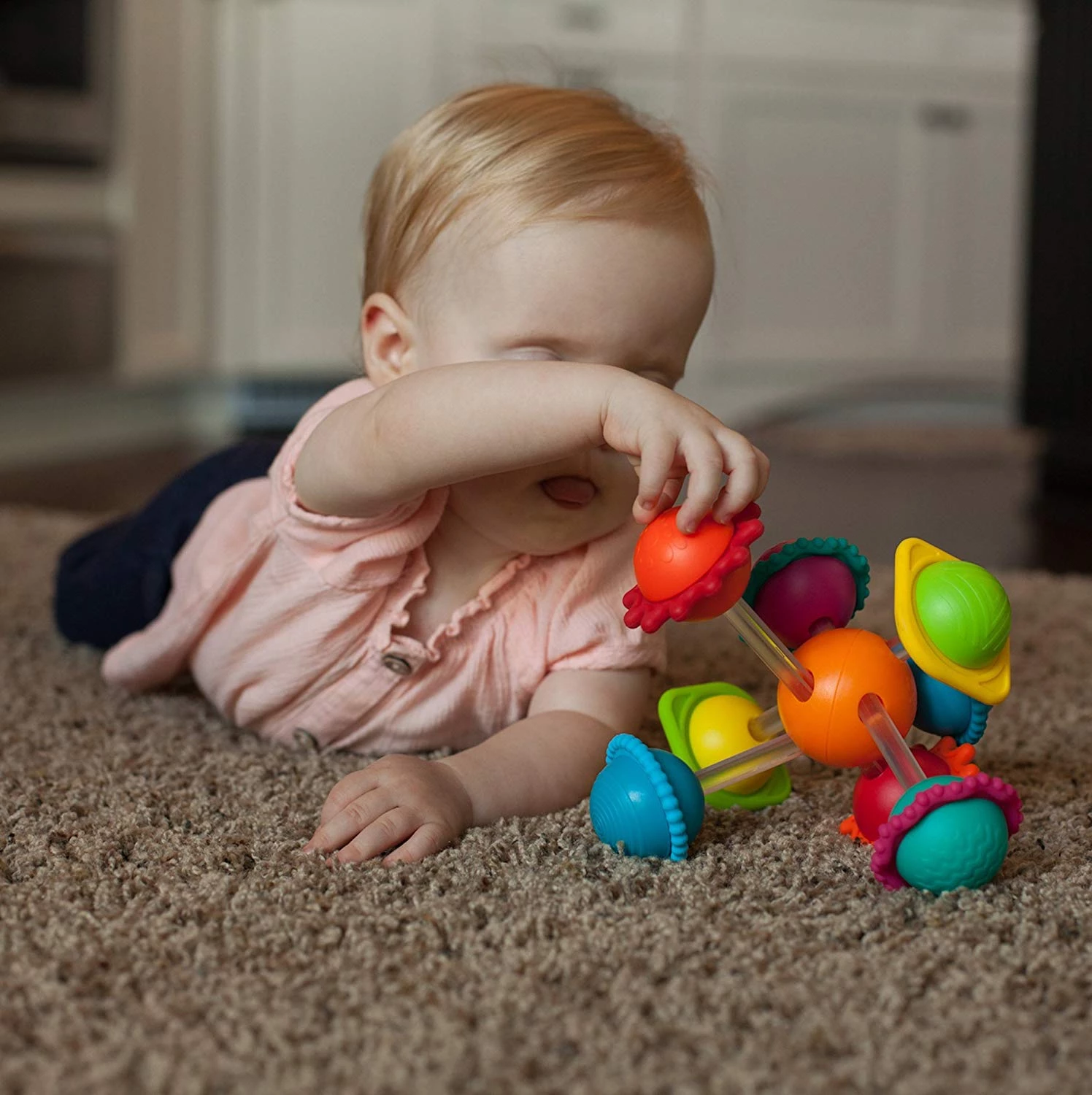 Wimzle - унікальна сенсорна іграшка від Fat Brain Toy, пригода для почуттів малюка, який відкриває світ. Незвичайна іграшка має вісім кульок, встановлених на чотирьох стержнях (палички, поперечини), які вміло розрізають центральну кулю.