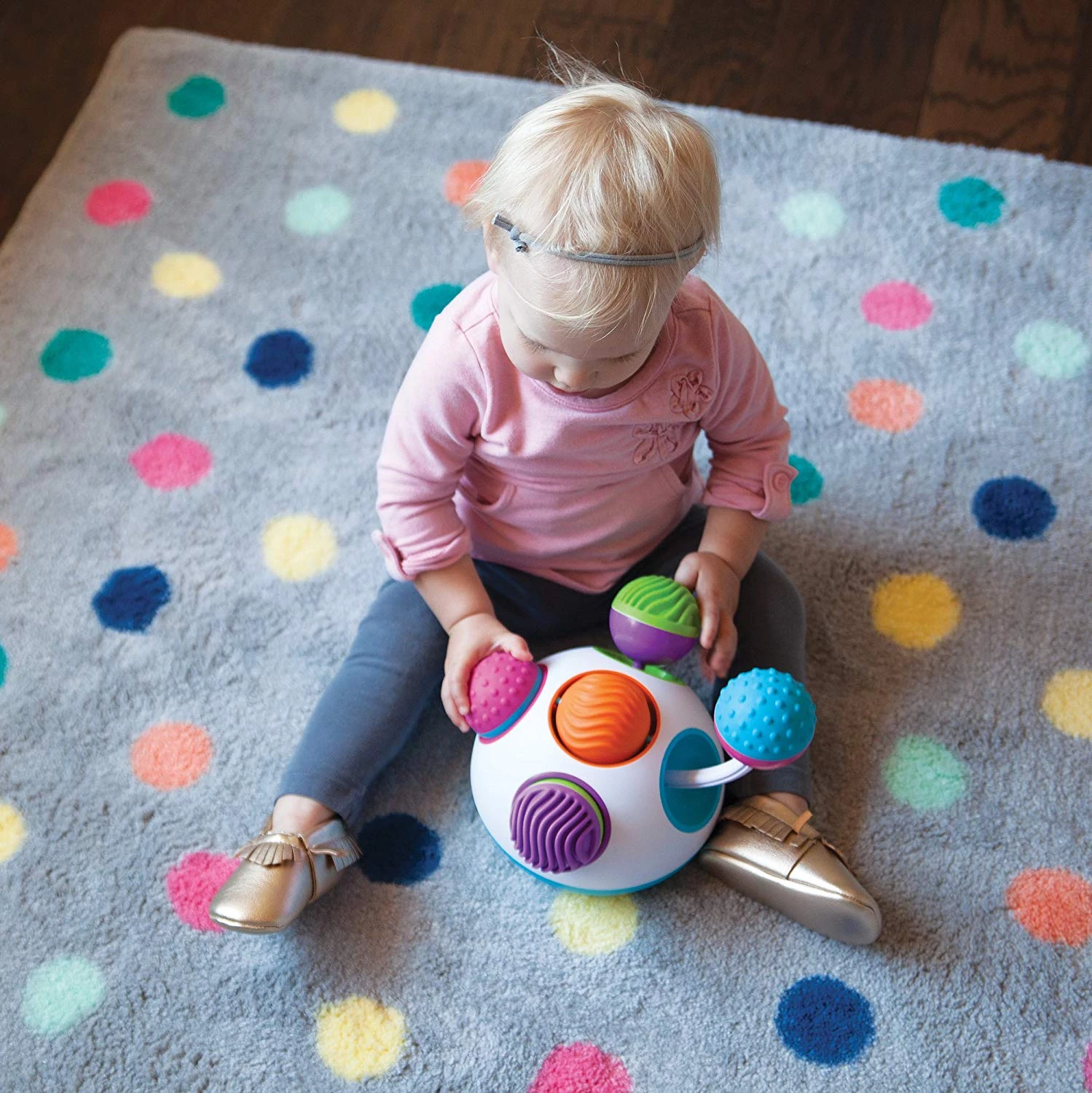 Натисніть на рожевий куля, щоб почути звук з тріскачкою. Зелені і пурпурні ручки натискають, як ручки, в той час як помаранчеву кулю зверху крутиться навколо. Плюс - всі вони мають унікальні та яскраві текстури, які дуже цікаві на дотик! Це відмінний спосіб по-справжньому захопити дитину.