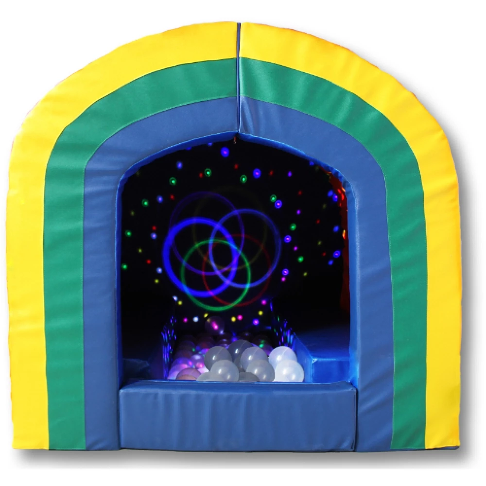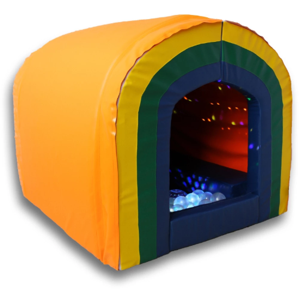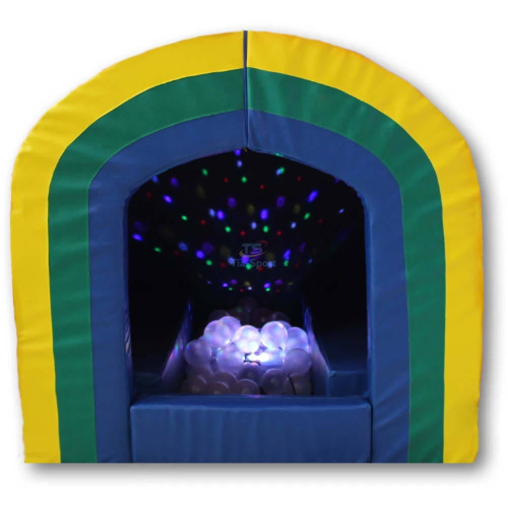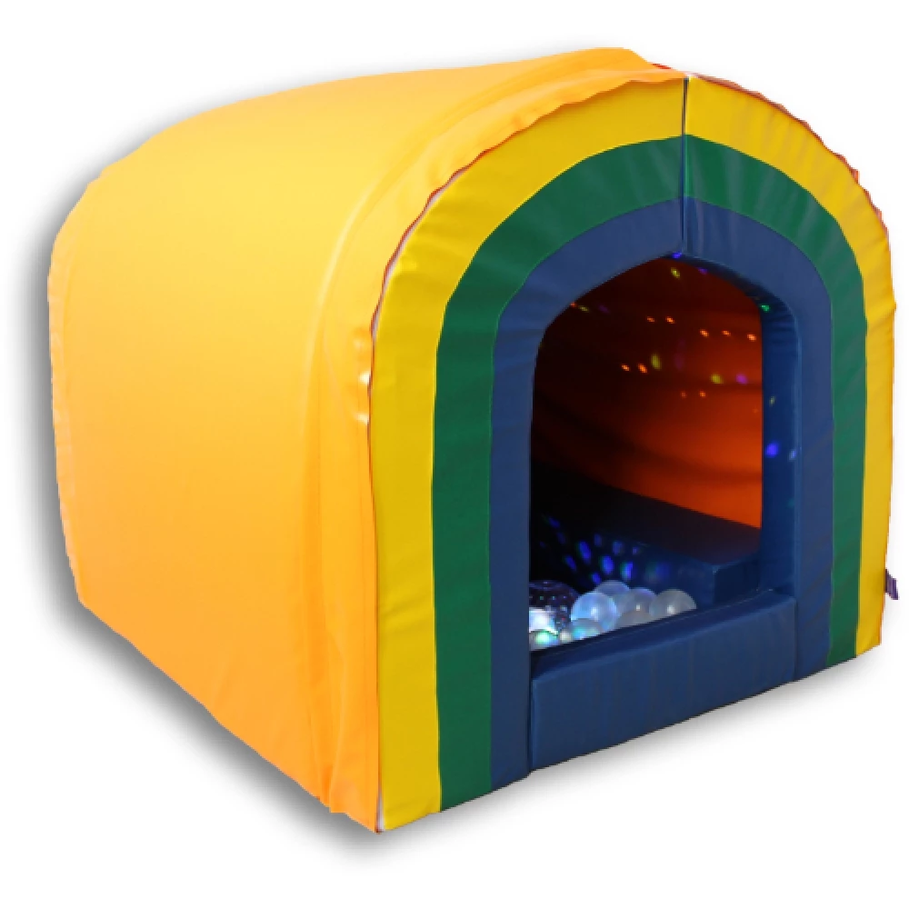 Справжня міні печера являє собою конструкцію, виготовлену за типом намета з розміщеними всередині блоками-лавочками. Дітям сподобається там грати, влаштовувати таємні наради з друзями. У верхній частині корпусу вмонтовано LED освітлення. Для тактильної терапії - всередину засипаються кульки. Конструкцію можна використовувати і в розібраному вигляді.