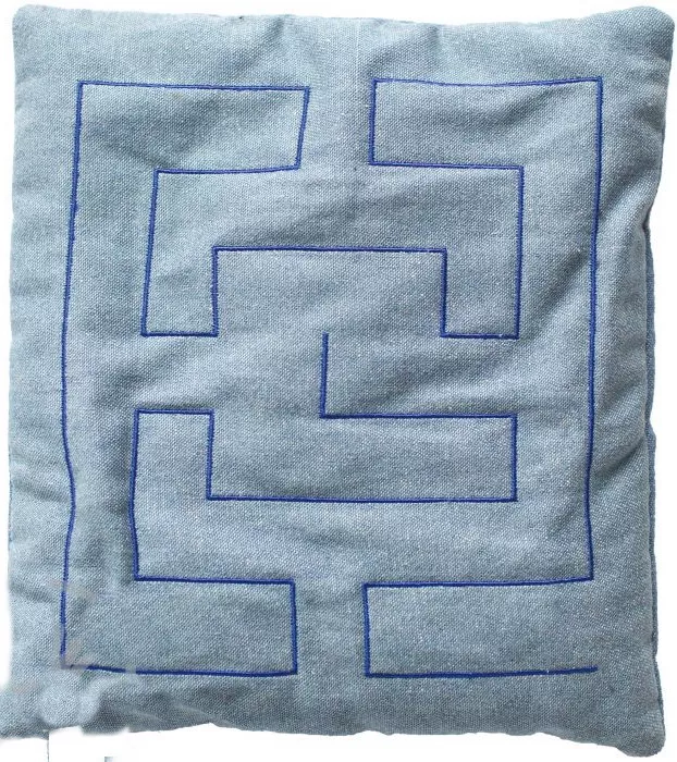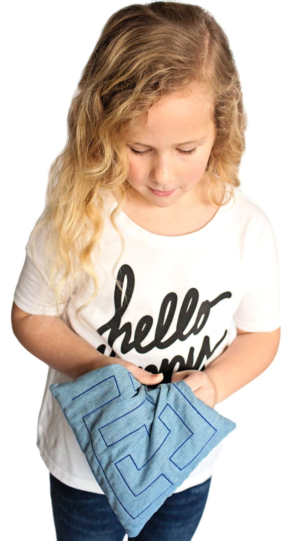 Стильний лабіринт, виконаний з міцного джинса і має певну сходинку у вигляді тунелів. Всередині знаходиться кулька, який потрібно рухати пальцями по проходах. Також, є спеціальні гранули, які чинять опір, що добре тренує маленькі пальчики. Подушка акцентує увагу на тактильних відчуттях, так як візуально простежити кулька не вийде. Це прекрасний варіант для дітей з особливостями розвитку і СДУГ. Лабіринт м'який і компактний, його легко брати з собою на прогулянки і в поїздки. Може використовуватися в якості міні-підставки для колін.