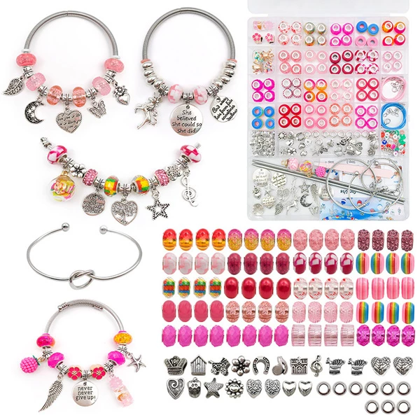 Кольорові намистинки, підвіски, нитки та застібки для створення унікальних браслетів, кольє й аксесуарів. Діти розвивають творче мислення, координацію рук і почуття стилю, створюючи власні моделі. Ідеальний подарунок для дівчаток, які люблять майструвати та фантазувати.
