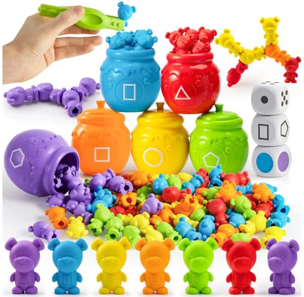 Ідеальний набір для маленьких архітекторів. Включає пластикові трубки та з’єднувальні елементи, з яких можна будувати форт, тунелі, куполи або хатки. Розвиває просторове мислення, креативність і командну роботу. Для ще більшої гри рекомендується накривати конструкції тканиною або покривалом. - Набір для рахунку і сортування Монтессорі Ведмедики (82 елемента) від JOYIN.