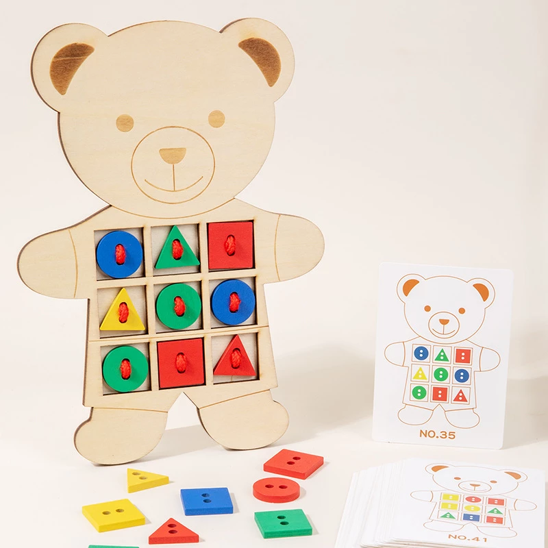 Ця гра пропонує малюкові допомогти чарівному ведмедику «пришити» різнокольорові ґудзики до його вбрання. У набір входить дерев'яна основа у формі ведмедика, комплект яскравих геометричних фігур та міцний червоний шнурок довжиною 74,5 см. Для цікавих занять передбачено 30 карток із завданнями, які вчать дитину повторювати запропоновані схеми розташування деталей.