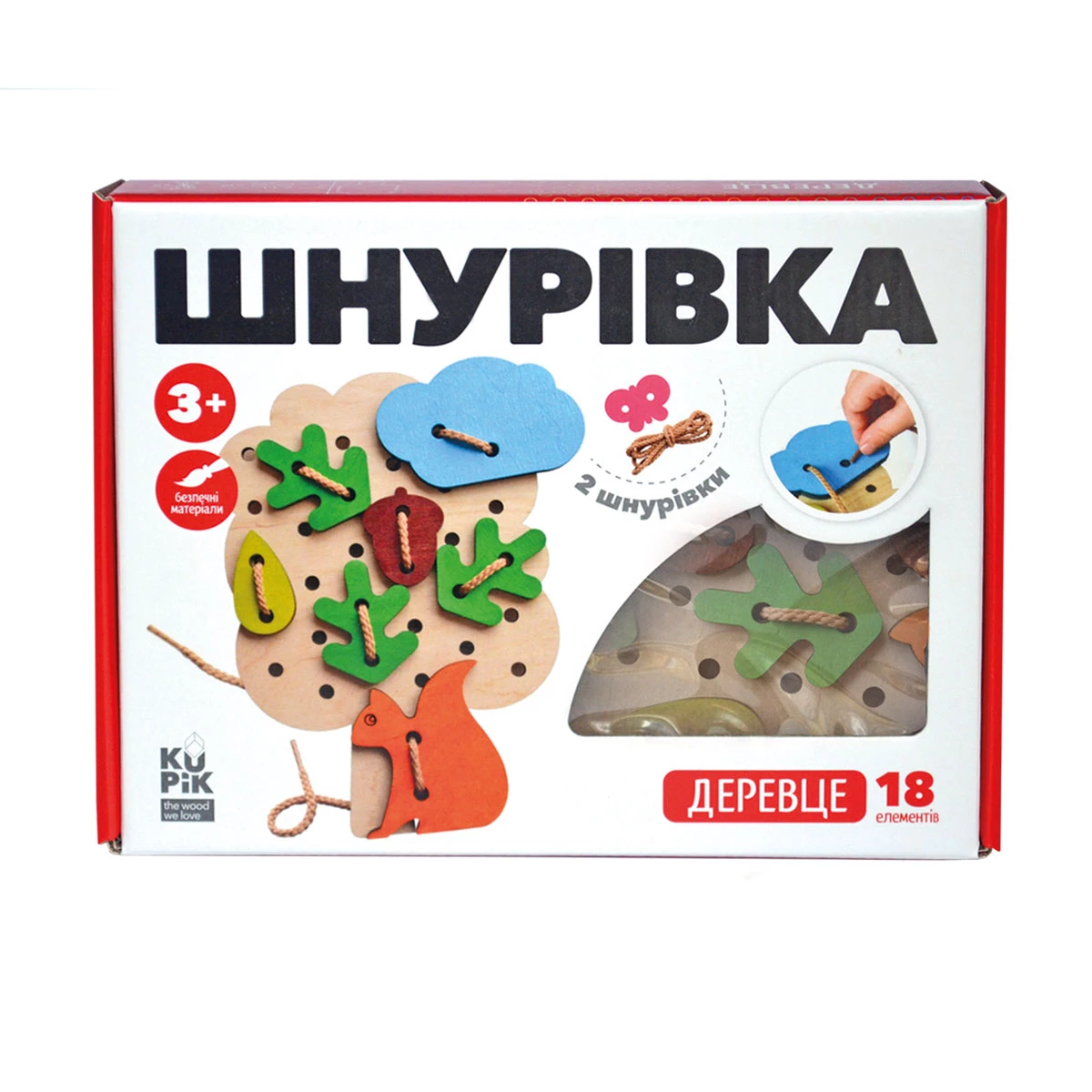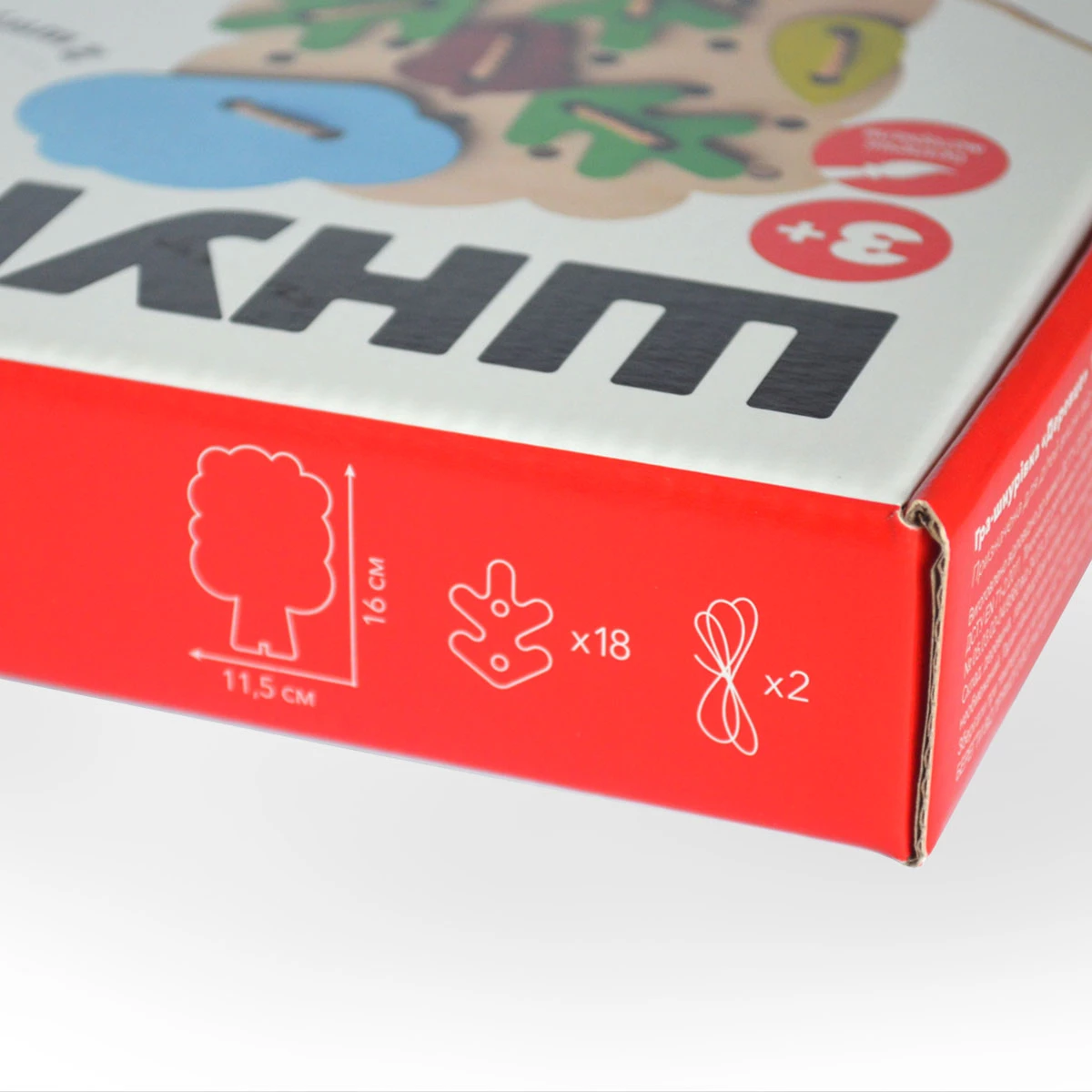 Ігровий набір складається з основи, виконаної у вигляді деревця, пари шнурків завдовжки 40 см і 18 кольорових елементів для шнурівки: білочки, яблука, жолудя та інших. Усі елементи набору розроблені з екологічно чистої сировини — натуральної деревини, приємної для тактильних відчуттів.