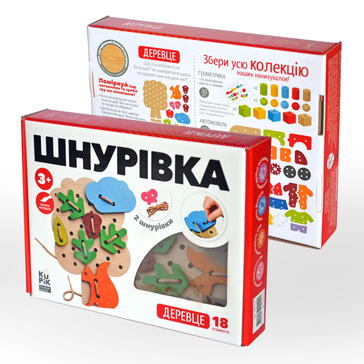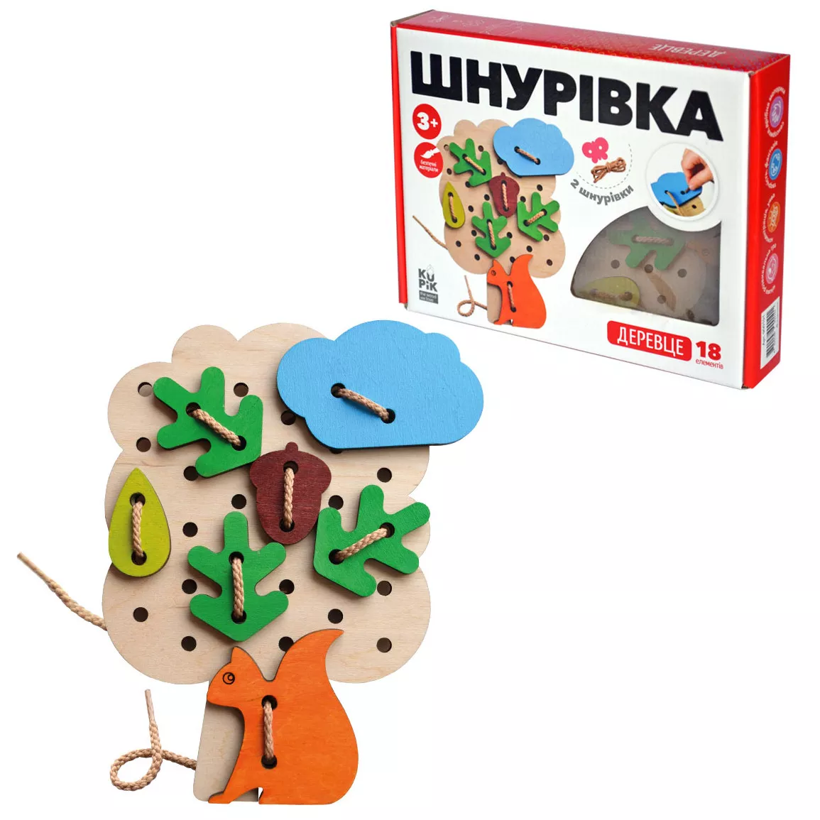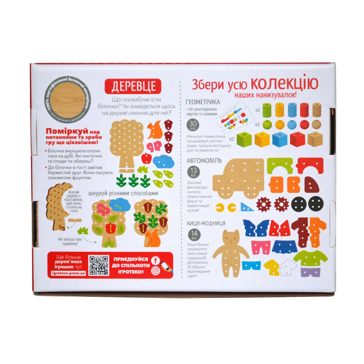Цікава дерев'яна іграшка-шнурівка Деревце націлена на розвиток багатьох корисних навичок. Представлений ігровий набір стане справжньою знахідкою для дітей віком від 3-х років. Нанизуючи на шнурки кольорові дерев'яні фігурки, дитина потренує дрібну моторику, навчиться приймати рішення без допомоги дорослих.