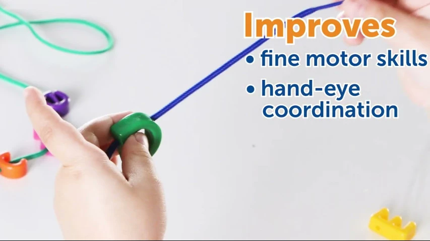 Сортуйте за літерами та кольорами або складайте прості слова. Навчіть дитину розпізнавати літери англійського алфавіту, складати візерунки та сортувати; розвивайте дрібну моторику. Пропонований набір включає 260 намистин для шнурівки і 15 шнурків райдужних кольорів.