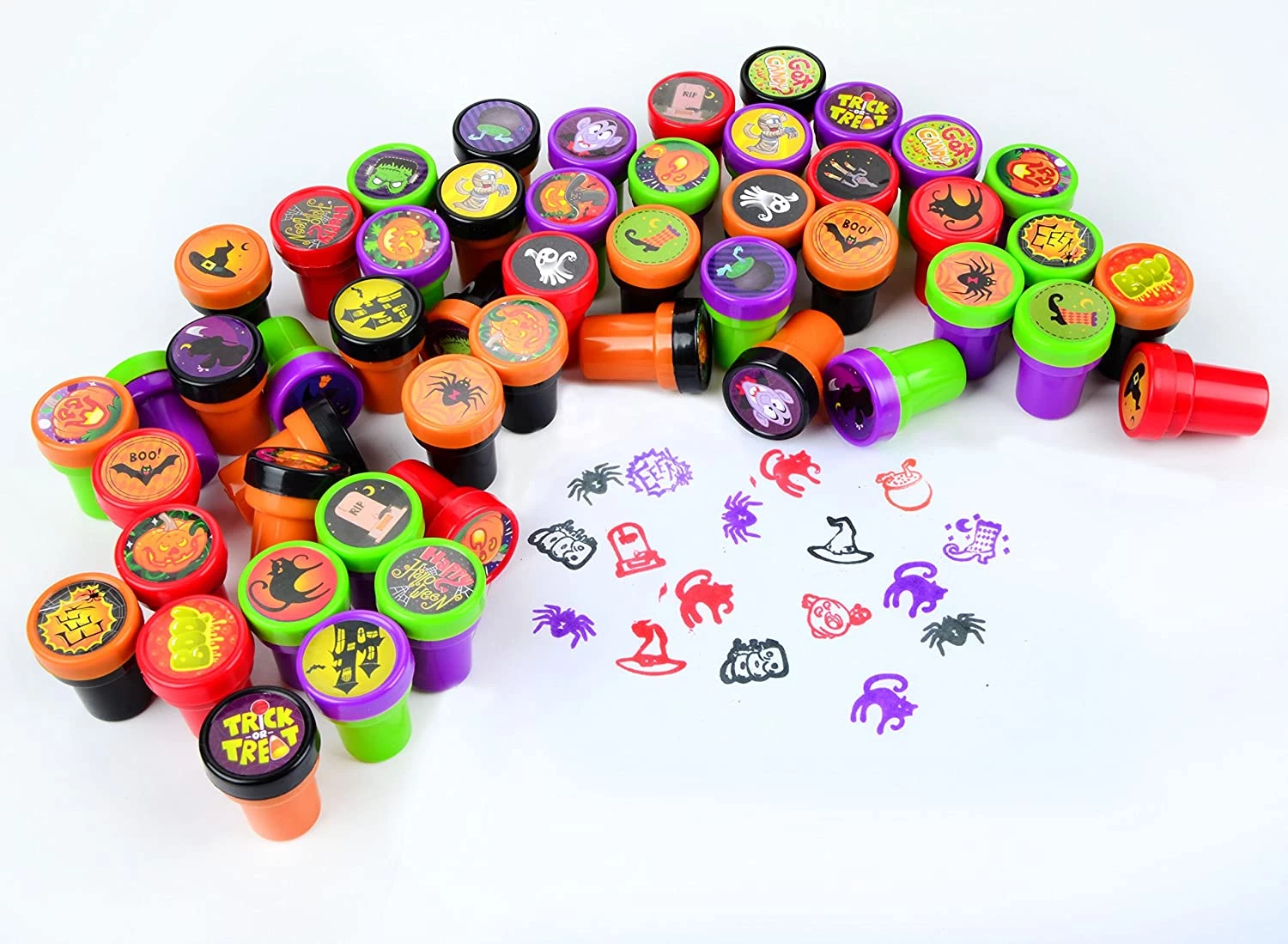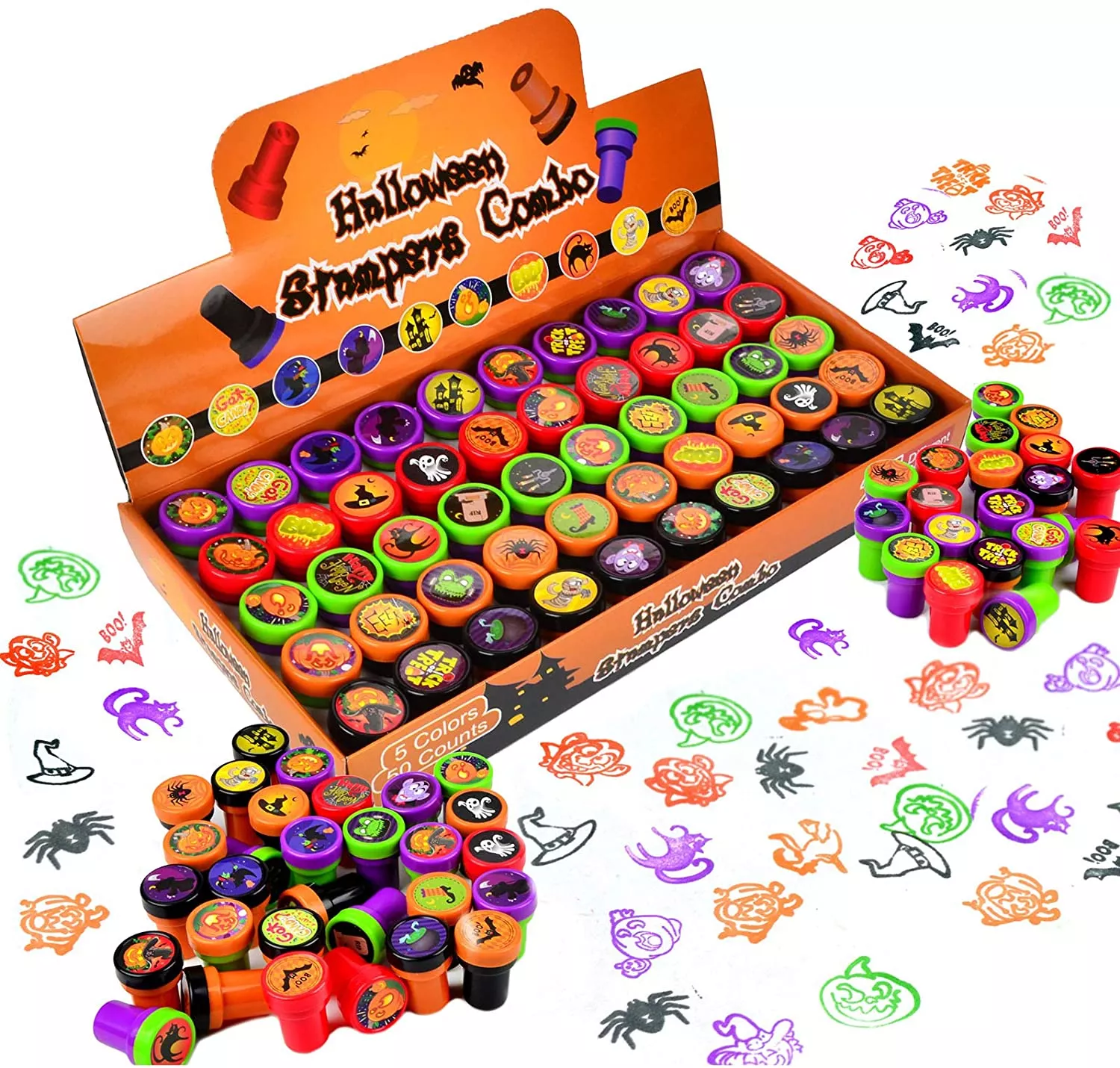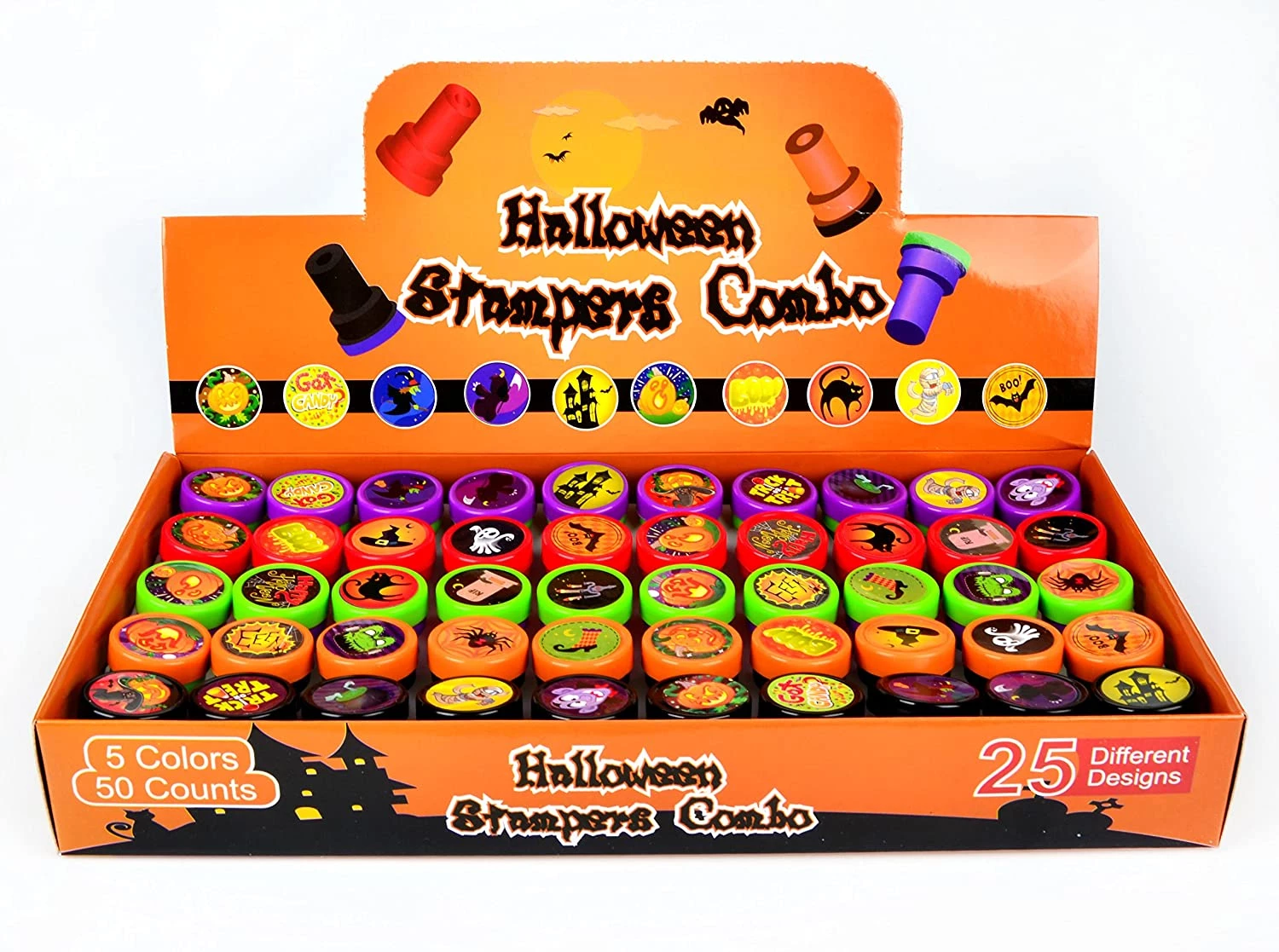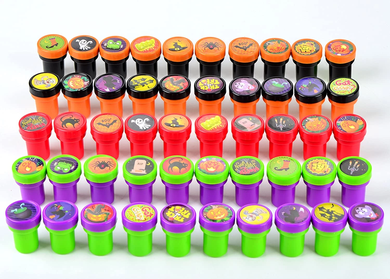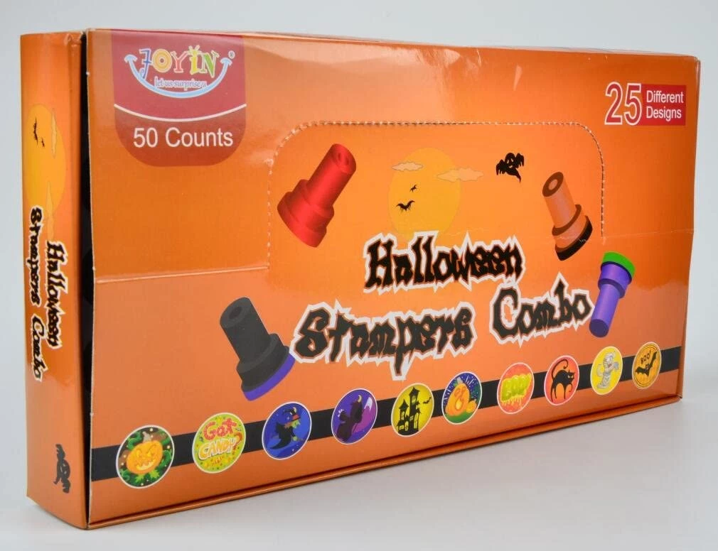 У наборі 50 штампів з 25 різними дизайнами (кожен дизайн має два різних кольори). Дизайн включають гарбуза, 6 найпопулярніших персонажів (привид, мумія, Франкенштейн, відьма, вампір і жнець), штампи кішок і частувань. 5 кольорів: гарбузово-оранжевий, чорний, фіолетовий, зелений Франкенштейн і кривавий червоний вампір).