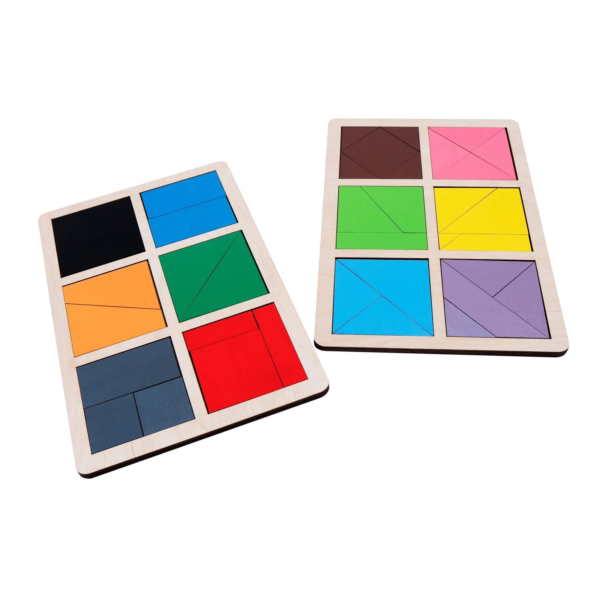 Дитині потрібно скласти квадрат з різних шматочків. Під час гри дитина вивчає кольори і форми, співвідношенням цілого і частини.
