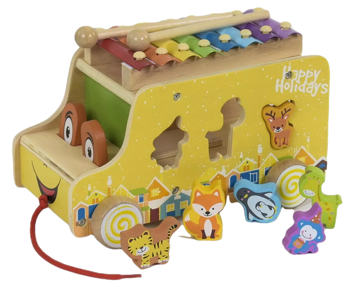 Веселий дерев'яний автобус каталка сприяє розвитку малюка, займаючи на довгий час. На даху є різнокольоровий ксилофон. Грати на ньому можна, використовуючи дві палички. А по боках машинки - захоплюючий сортер. Дитині потрібно правильно знайти фігурку тварини і вставити в отвір віконце.