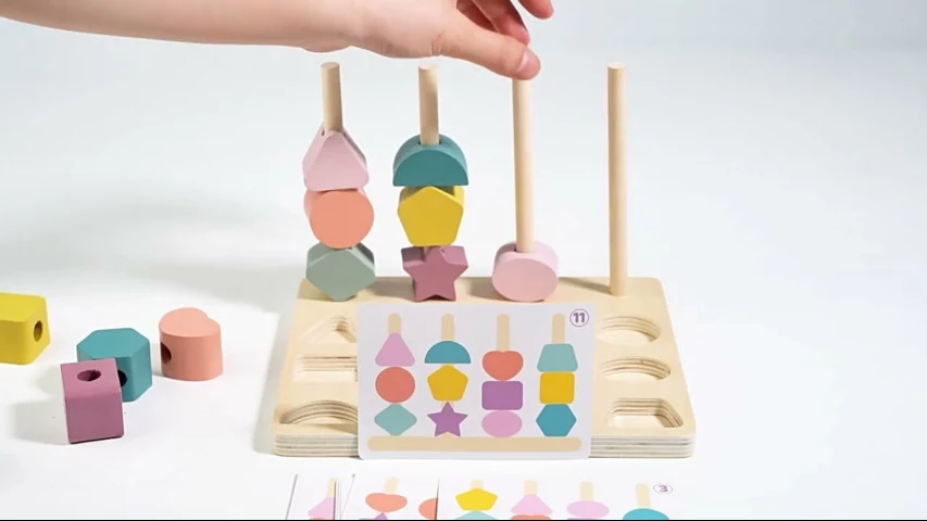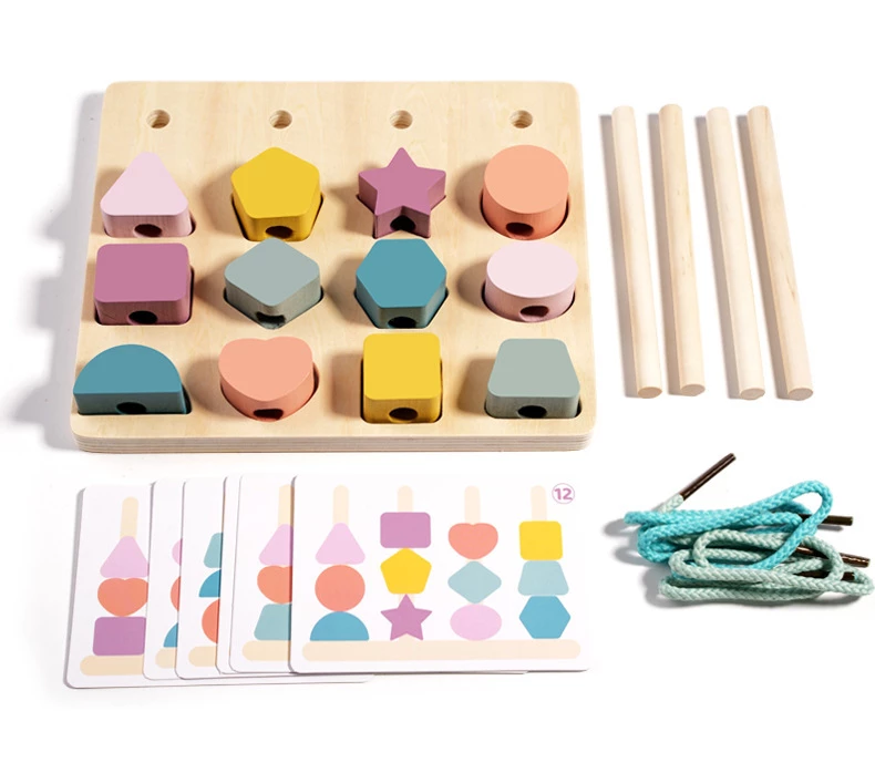 Іграшка-сортер - чудовий освітній інструмент, розроблений для підтримки розвитку дітей раннього віку. У представлений набір входять 12 різнокольорових дерев'яних блоків різних форм, дерев'яна основа з прорізами для відповідних фігур, кілька шнурків для шнурівки, а також комплект карток із шаблонами.