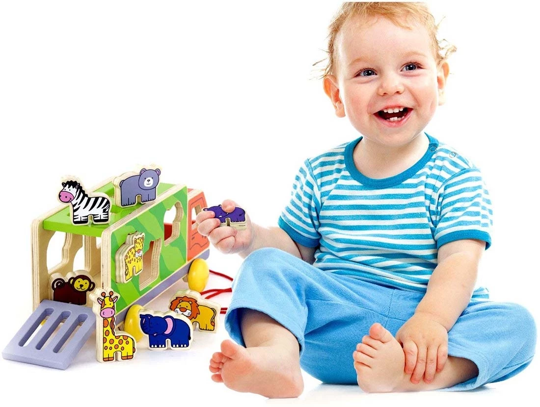 Яскрава кольорова вантажівка, в якій їдуть різні тварини, захоплять дитину на довгий час. Каталка зроблена з дерева, з відмінно відшліфованими краями. У кузові вантажівки є отвори у вигляді фігурок тварин. Дитина повинна правильно підібрати фігурку тварини до отвору в кузові. А ще з фігурками можна грати окремо.