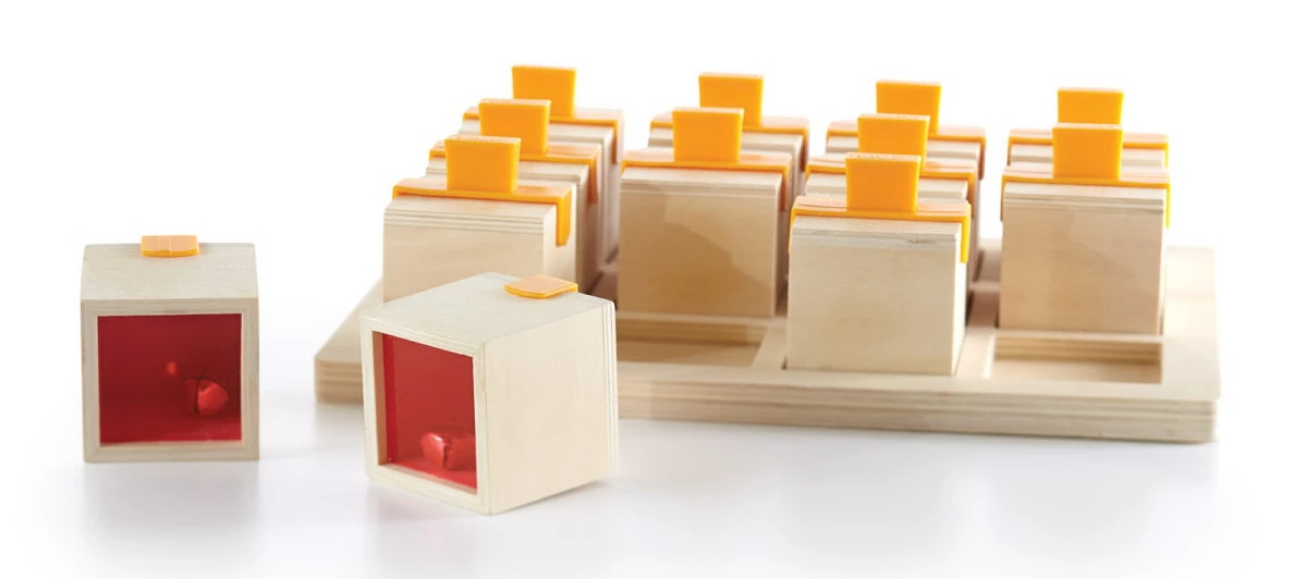 Візьміться за м'яку пластикову ручку. Струсіть дерев'яний кубик, щоб почути унікальний звук. Струсіть інші. Знайдіть збіг.