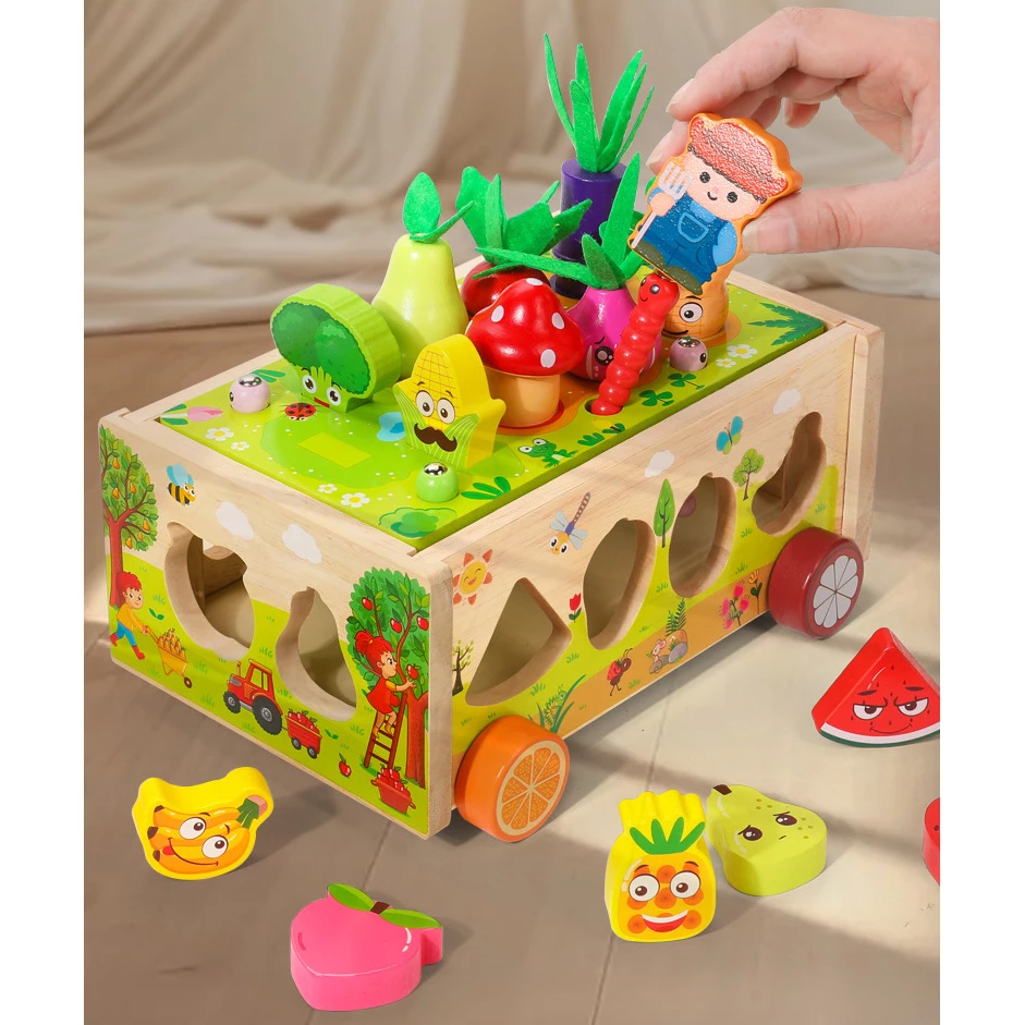 Дерев'яний навчальний набір Монтессорі включає 10 фруктових кубиків, 2 моркви, капусту, 2 гриби, 8 черв'яків, візок і ігрове поле у вигляді грядки. Іграшка повністю виготовлена із натурального якісного дерева з нетоксичною фарбою на водній основі. Всі елементи сортера ретельно відполіровані, гладкі та приємні на дотик. Ця іграшка розвиває навички диференціації форми, кольору та розміру у малюків. Барвистий набір для сортування фруктів і збору врожаю покращує дрібну моторику дітей, а дятел, що входить до комплекту, ловить черв'яків і тренує зорово-моторну координацію.Цей набір передбачає безліч способів гри, які неодмінно сподобаються малечі. Діти можуть грати в гру «Складання», дізнаватися про фрукти та кольори за допомогою милих будівельних блоків. Запросіть друзів малюка пограти в ігри з морквою, магнітним дятлом і черв'яками, і малюкам гарантовано захопливе проведення часу.