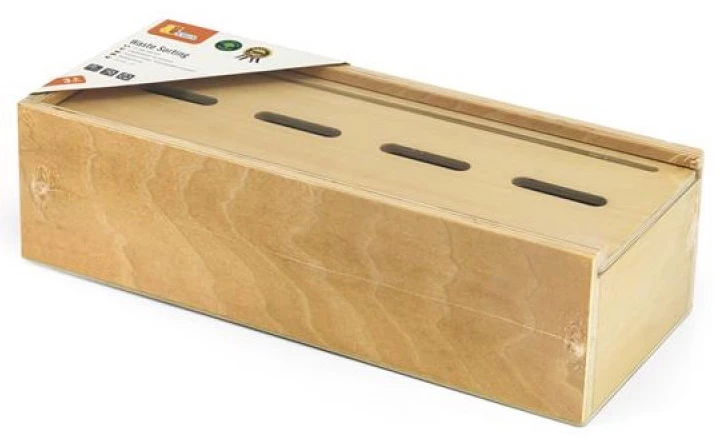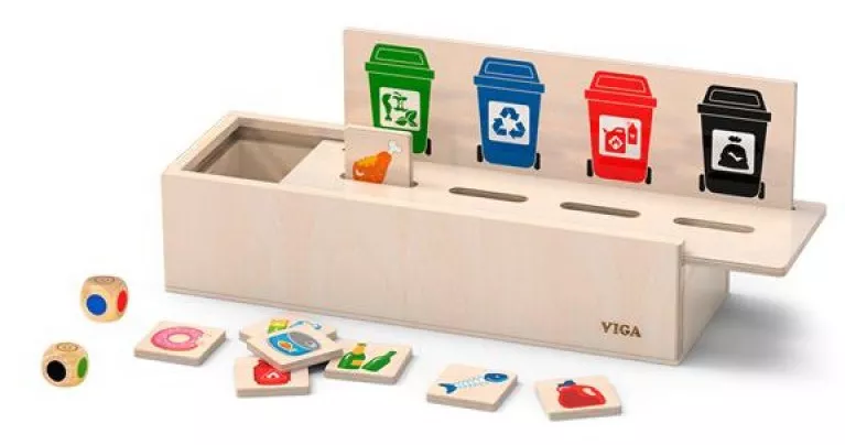 Даний дерев'яний сортер - це прекрасна можливість навчити дитину сортувати сміття, показати, як можна дбати про екологію. Є кілька відсіків для кожного виду відходів і картки із зображеннями, які і потрібно розсортувати. На 50 дерев'яних плитках зображені продукти харчування і предмети домашнього вжитку.