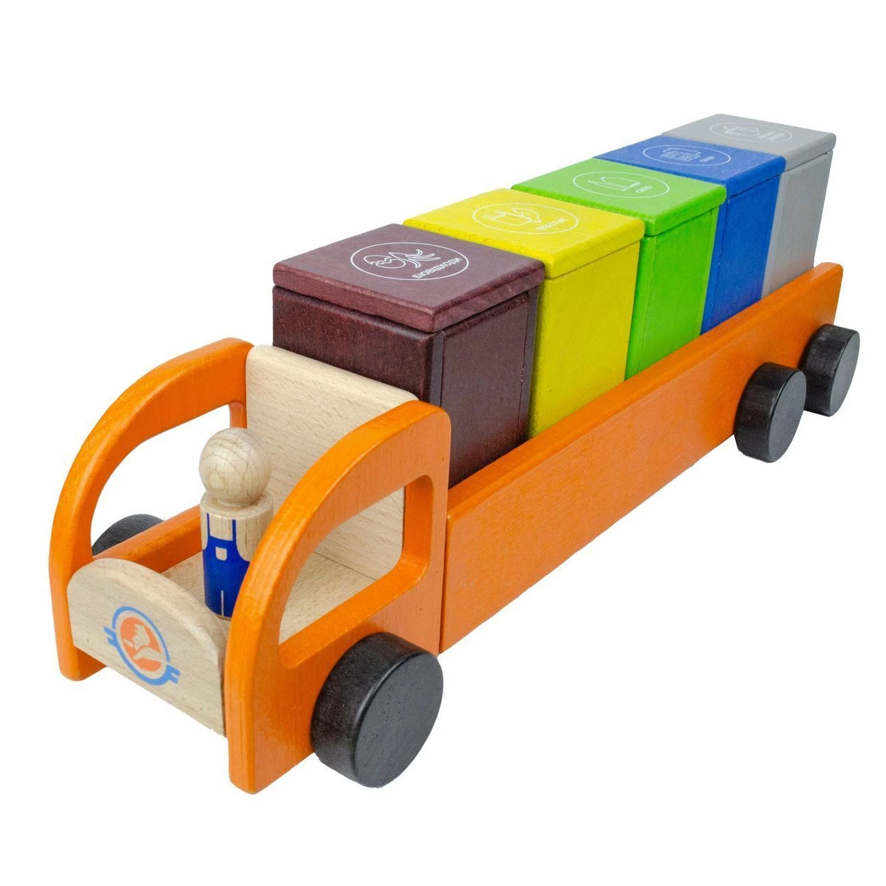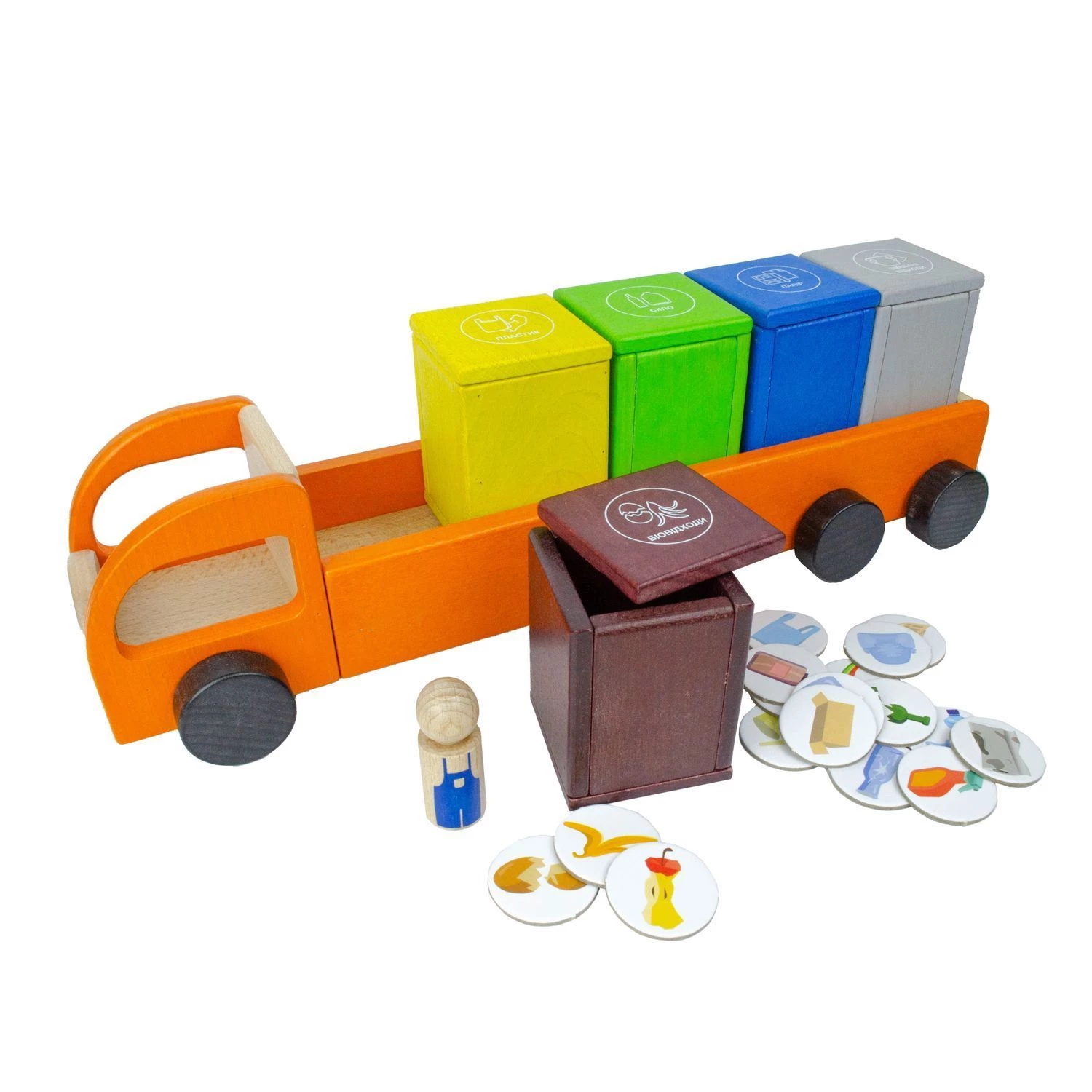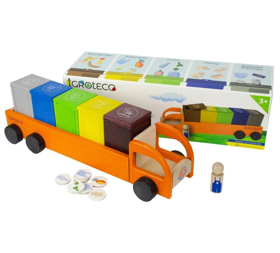 Представлена дерев'яна іграшка допоможе дитині в ігровій формі навчитися сортувати сміття. Набір включає дерев'яну каталку-сміттєвоз, пофарбовану безпечними для дитячого здоров'я фарбами, а також різнокольорові контейнери для відходів різного типу: