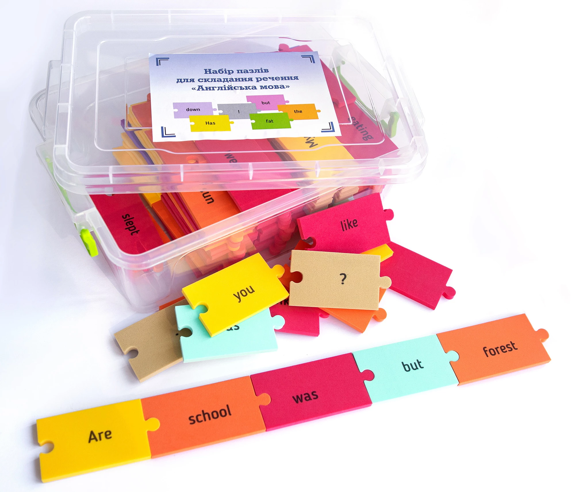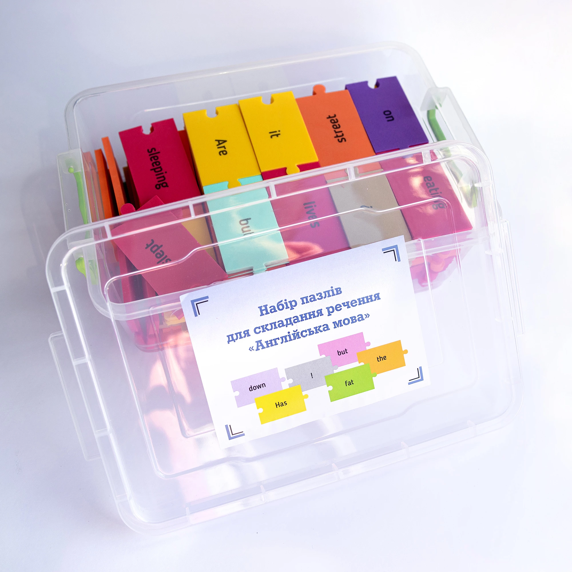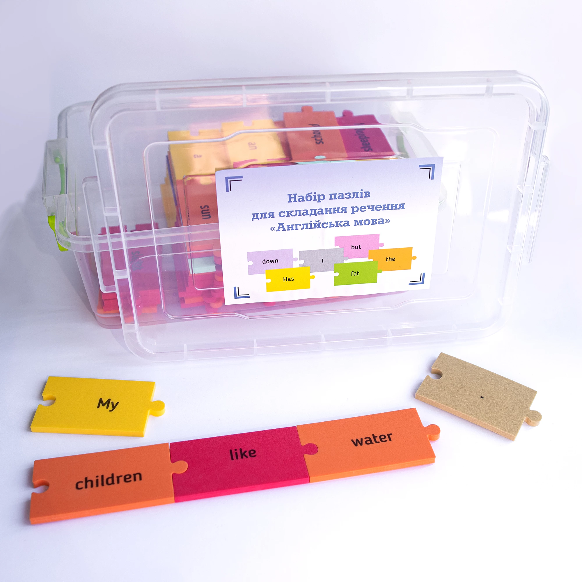 Розвиваючий комплект призначений для практики англійської мови Рівень 1. За допомогою різнокольорових пазлів зі словами необхідно складати речення. Це допомагає збільшити словниковий запас і практикувати граматику. Елементи складаються з м'якого, надійного і безпечного матеріалу. Вони містять слова з різних частин мови. Крім вивчення англійської мови відбувається розвиток дрібної моторики, що добре позначається на загальному інтелекті. Підійде для індивідуальних занять вдома і з педагогом.