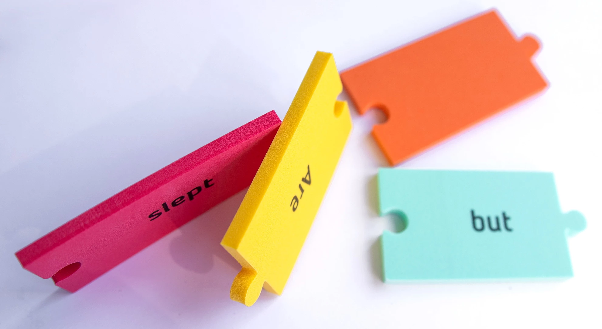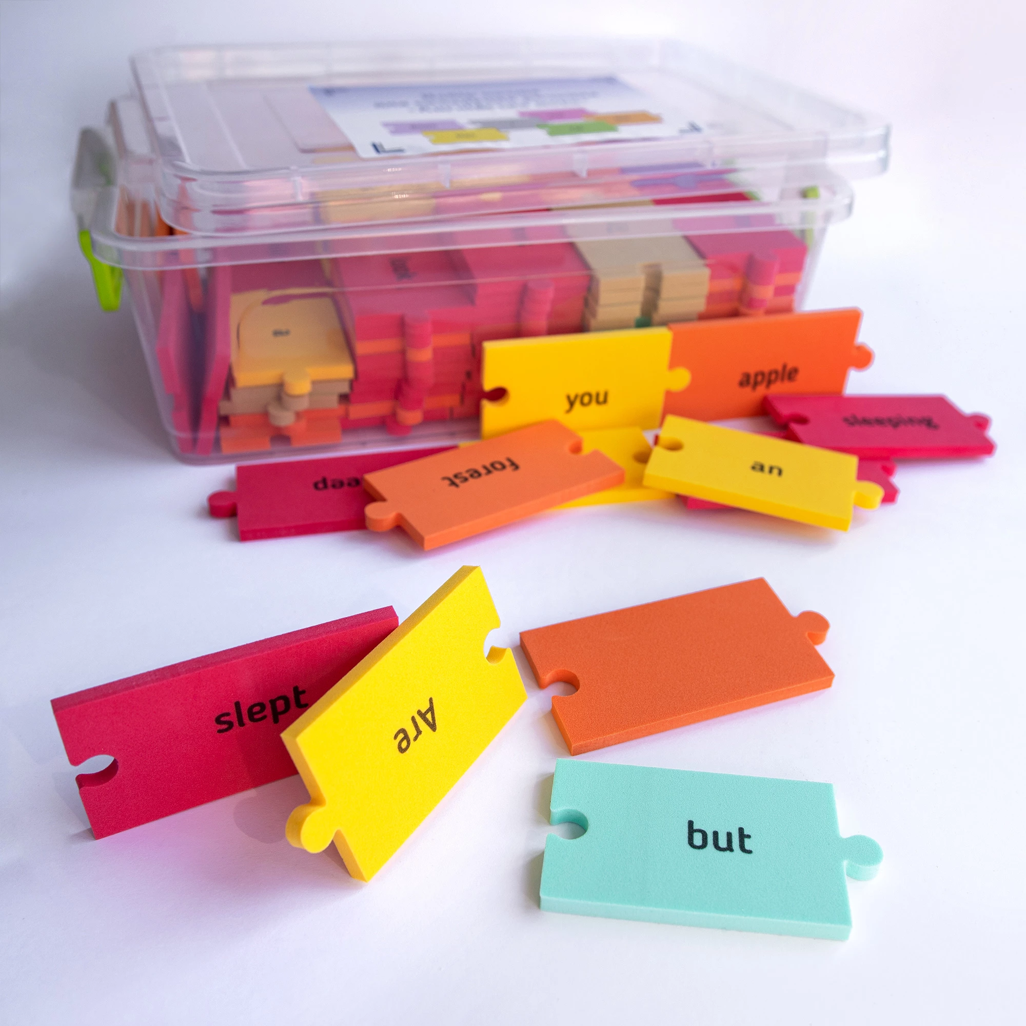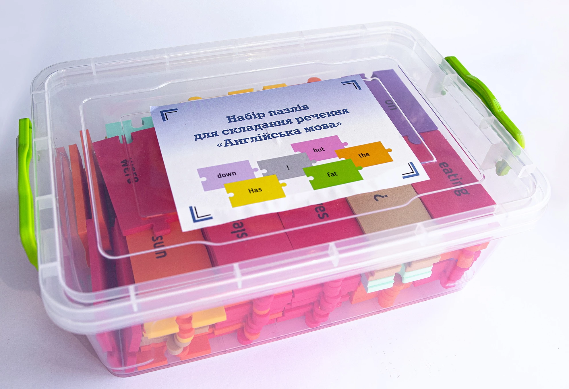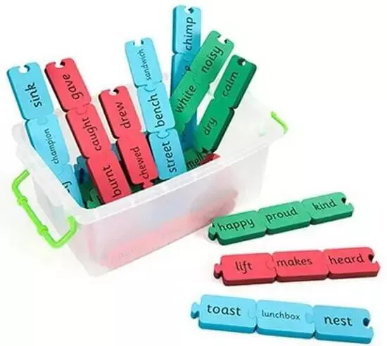 Розвиваючий комплект призначений для практики англійської мови Рівень 1. За допомогою різнокольорових пазлів зі словами необхідно складати речення. Це допомагає збільшити словниковий запас і практикувати граматику. Елементи складаються з м'якого, надійного і безпечного матеріалу. Вони містять слова з різних частин мови. Крім вивчення англійської мови відбувається розвиток дрібної моторики, що добре позначається на загальному інтелекті. Підійде для індивідуальних занять вдома і з педагогом.