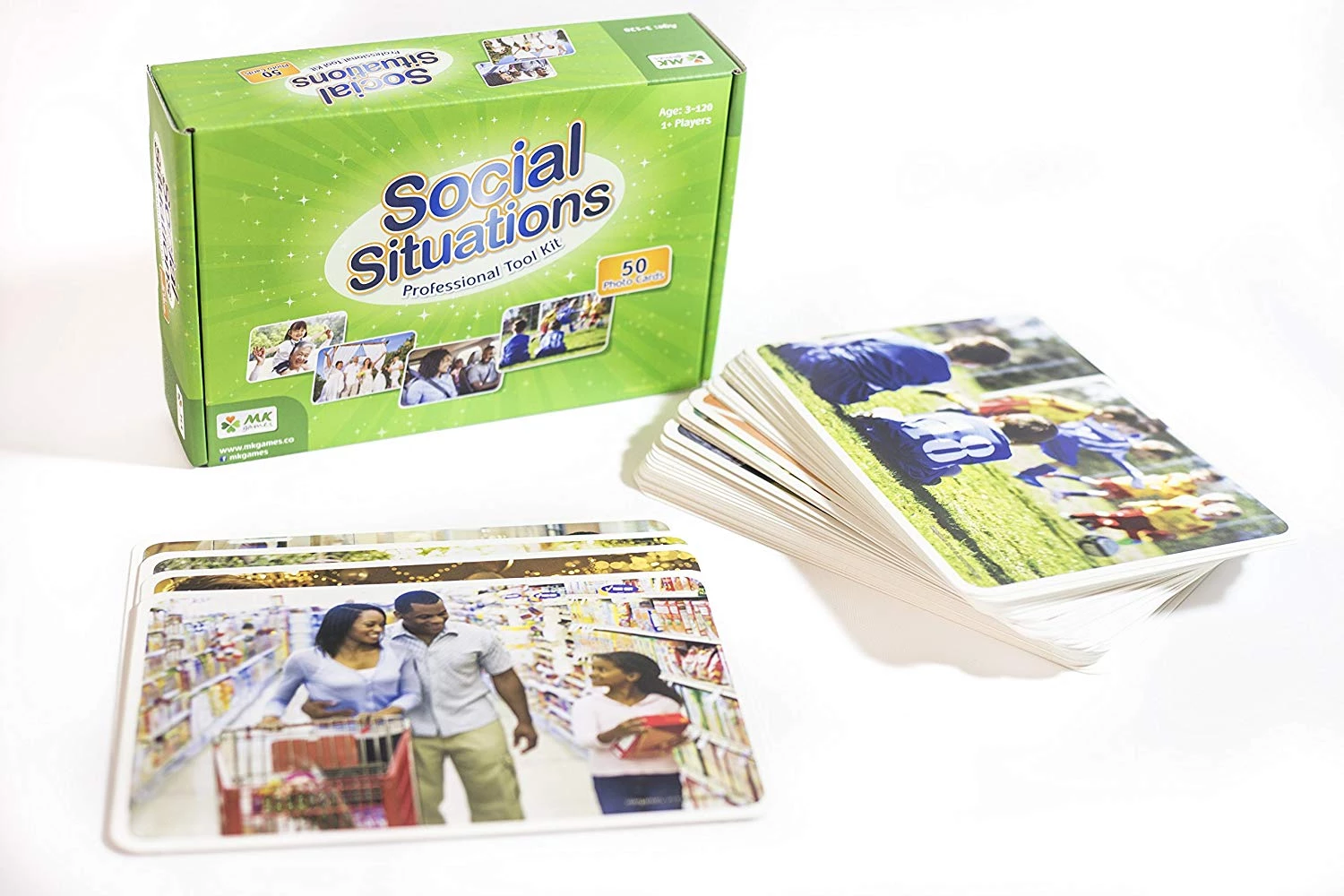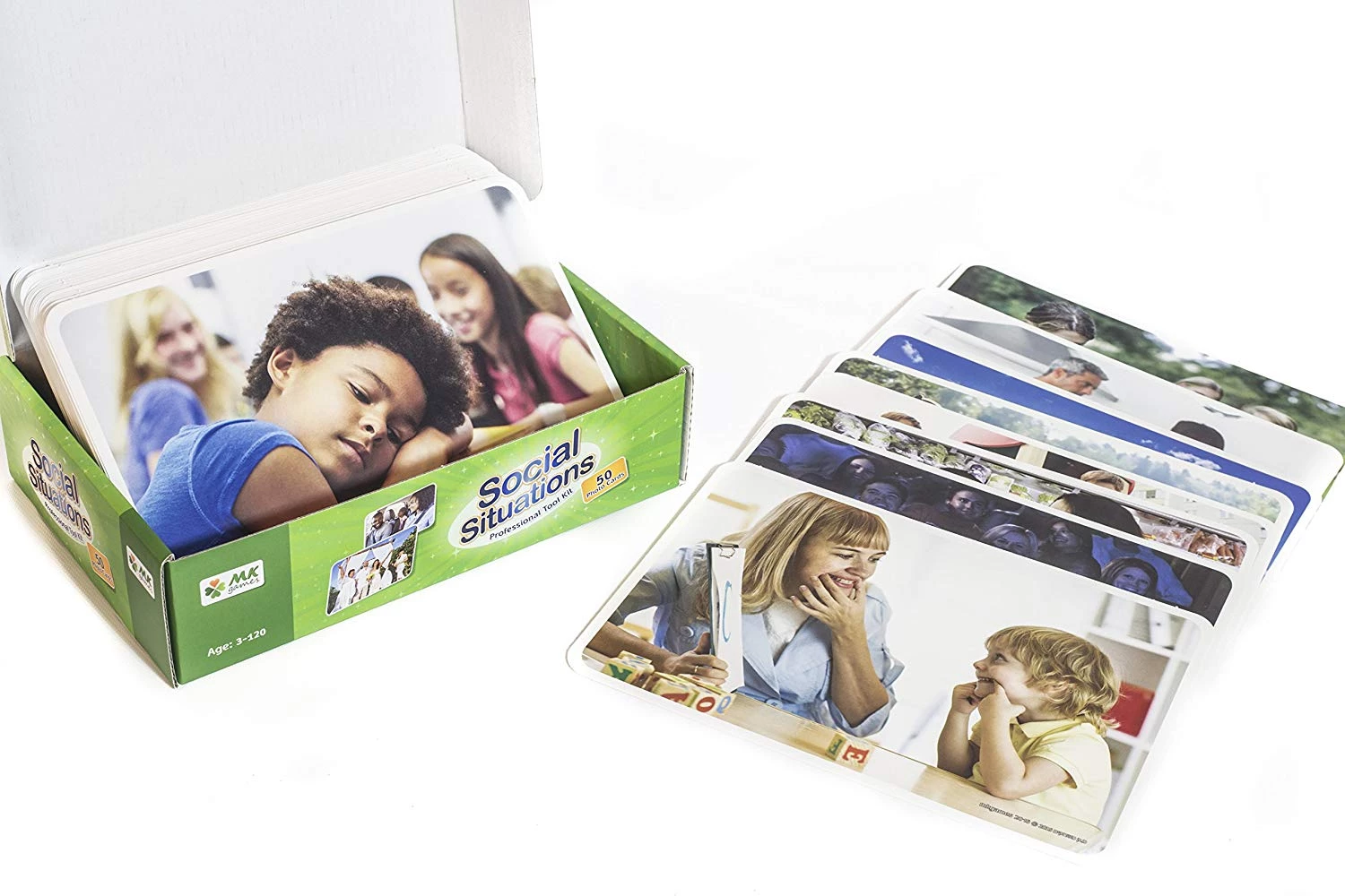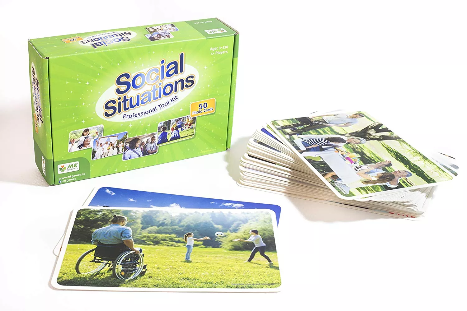 50 різних фотокарток із зображенням соціальних ситуацій є ідеальним професійним інструментом для терапевтів, педагогів, батьків, фахівців з трудотерапії, для індивідуальної і групової роботи, для роботи з пацієнтами з хворобою Альцгеймера, деменції та аутизмом. На кожній картці зображені різні ситуації: сімейний обід, соціальна зустріч, спільна робота і багато іншого. Ідеально підходить для спілкування, роздумів і розвитку соціальних навичок.
