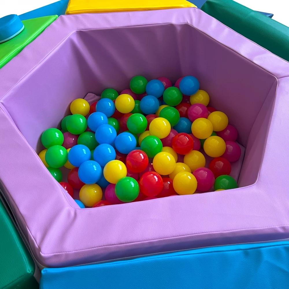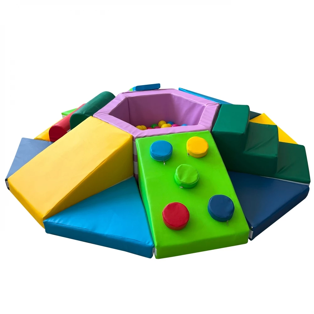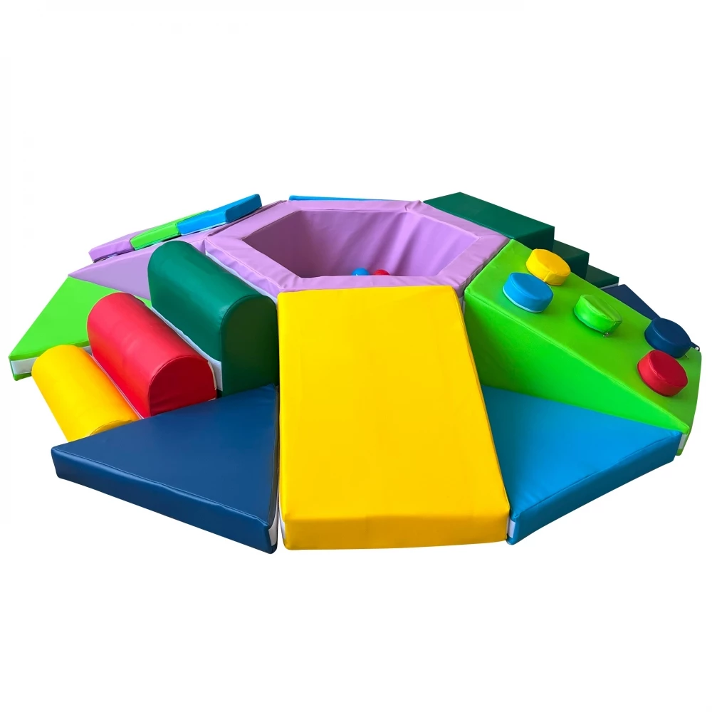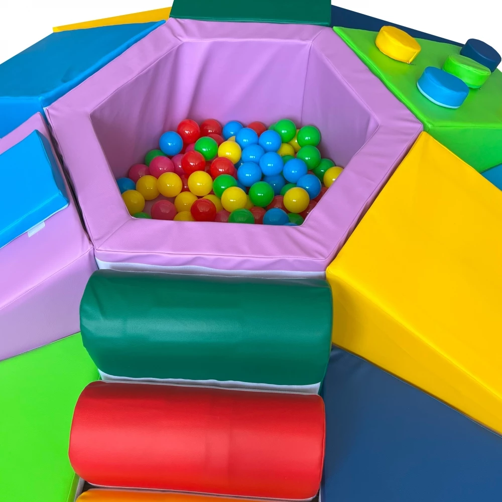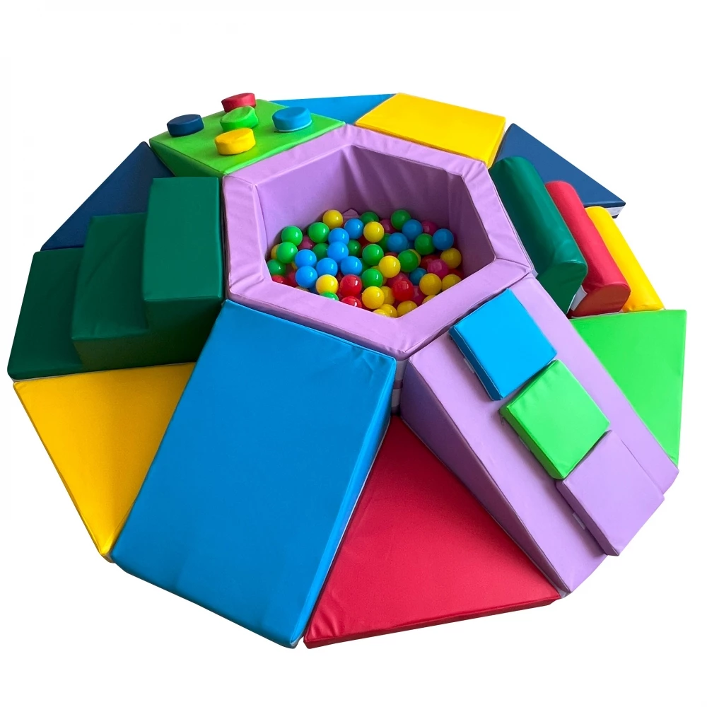 Одна з найпопулярніших дитячих іграшок - м'який ігровий тренажер. Дана модель зроблена у вигляді гори з безліччю перешкод. У центрі тренажера розташований сухий басейн, від якого будуть в захваті всі діти! Він сприяє зняттю стресу, зміцнення хребта і м'язів. З боків вироби різні перепони, за якими дитині необхідно дертися, що позитивно впливає на фізичні здібності. Набивання з поролону забезпечує м'яке падіння і не дає травмуватися маляті.