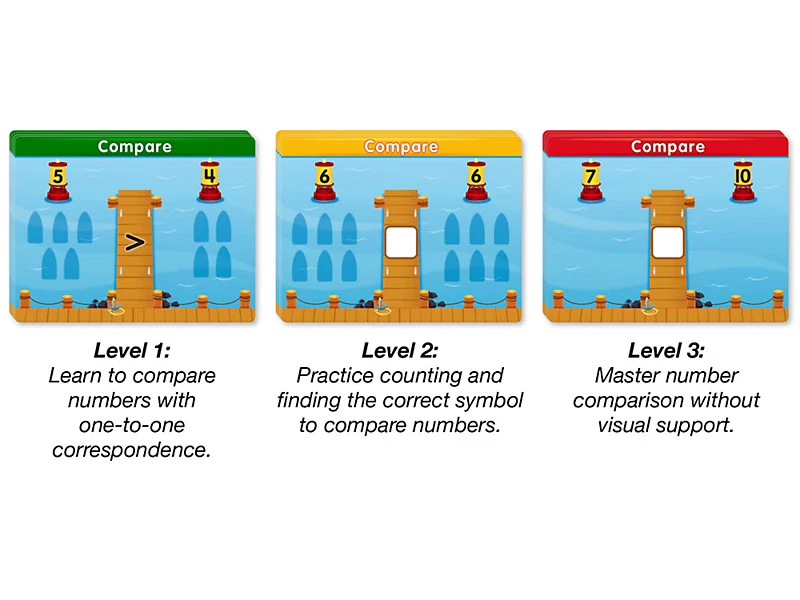 Вдосконалюйте навички порівняння чисел за допомогою цього математичного набору від торгової марки Lakeshore! У комплект входять картки із завданнями трьох рівнів складності — починаючи із заповнених символів та допоміжних ілюстрацій та переходячи до завдань із відсутніми відповідями, але з візуальним керівництвом, закінчуючи незалежним, неконтрольованим порівнянням чисел. Діти використовують човни та плитки із символами для заповнення карток із завданнями, набуваючи впевненості у міру переходу від рівня до рівня — ідеальний спосіб отримати важливі практичні навички. Набір включає 30 карток, 80 корабликів, 8 плиток з символами, а також керівництво.
