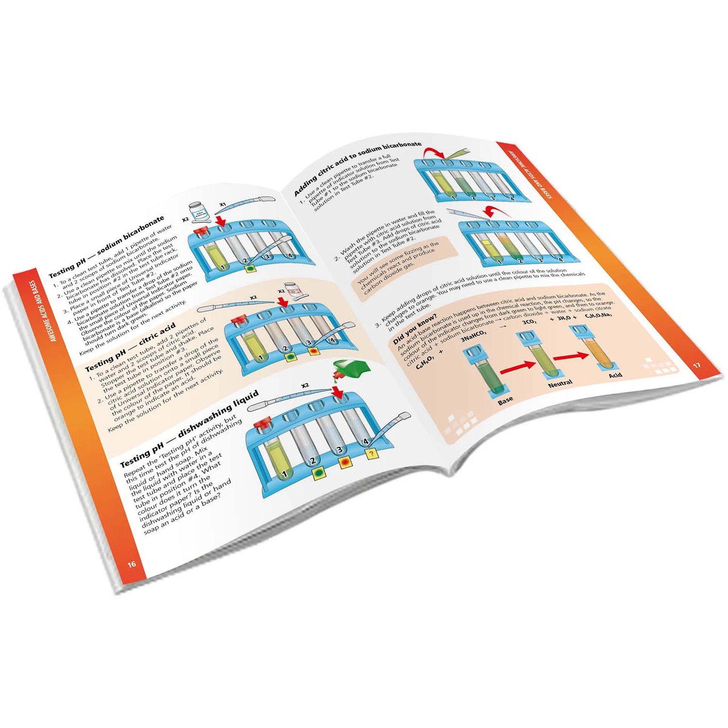 Бікарбонат натрію, лимонна кислота, мідний сульфат, універсальні смуги індикатора, стакан, пробірки і пробки, пробка пробка з отвором, стійка пробки, пластикова трубка, шприц, Pipettes, гнучка труба, окуляри, рукавички, рідкий колір, свічка, шерсть і малий флакон , повітряні кулі, воронка, папір фільтр, частина цинку. Додатково знадобляться деякі матеріали з домашнього вжитку.