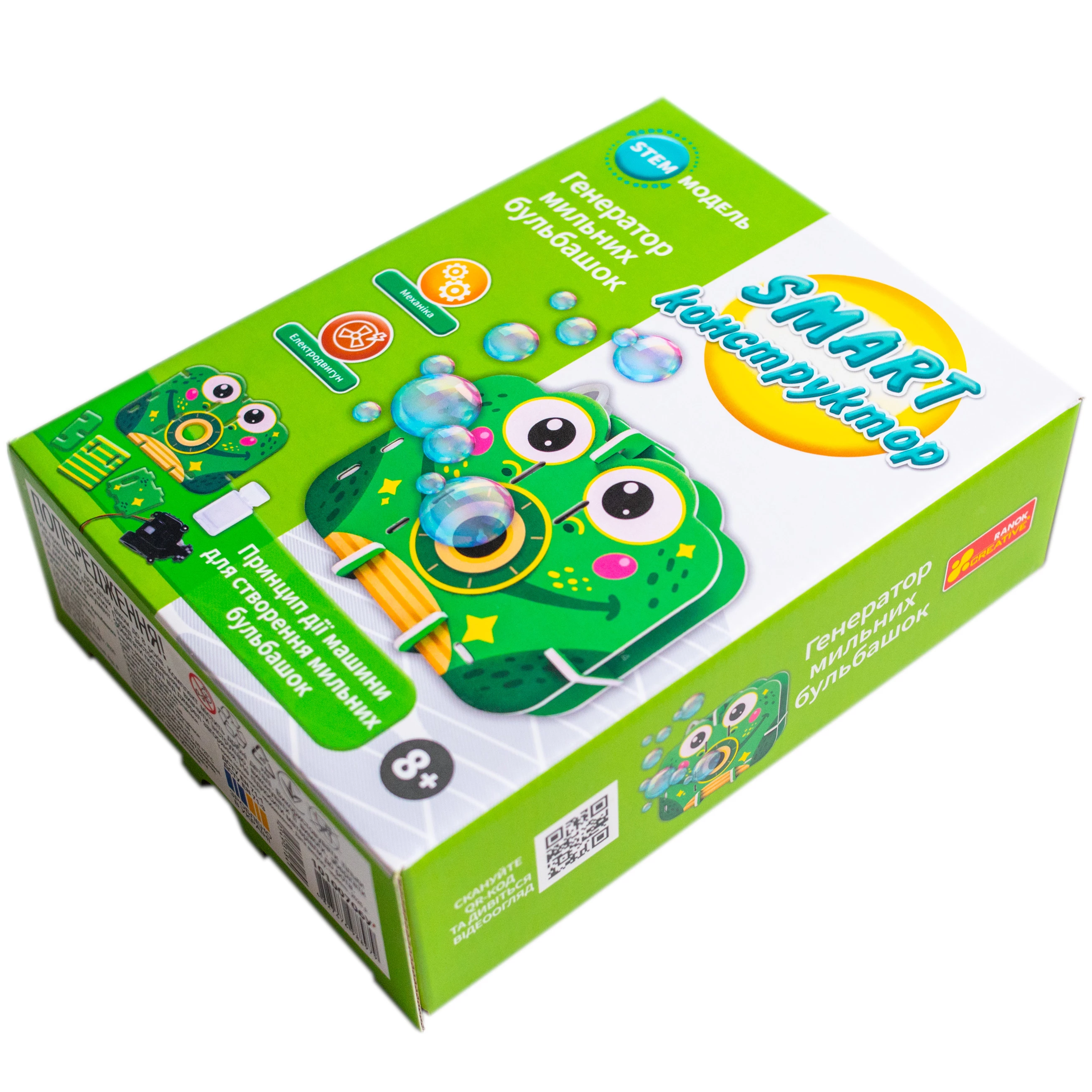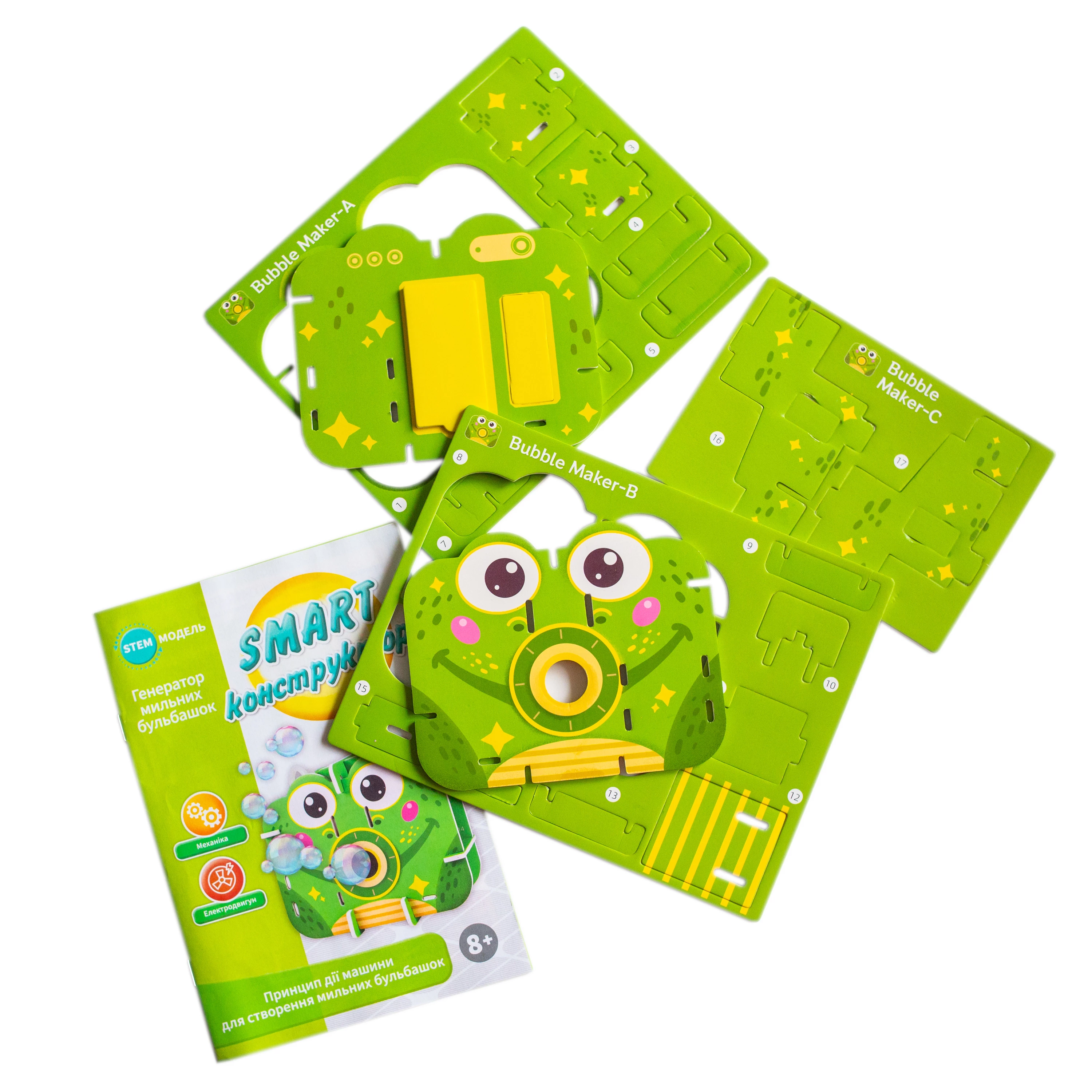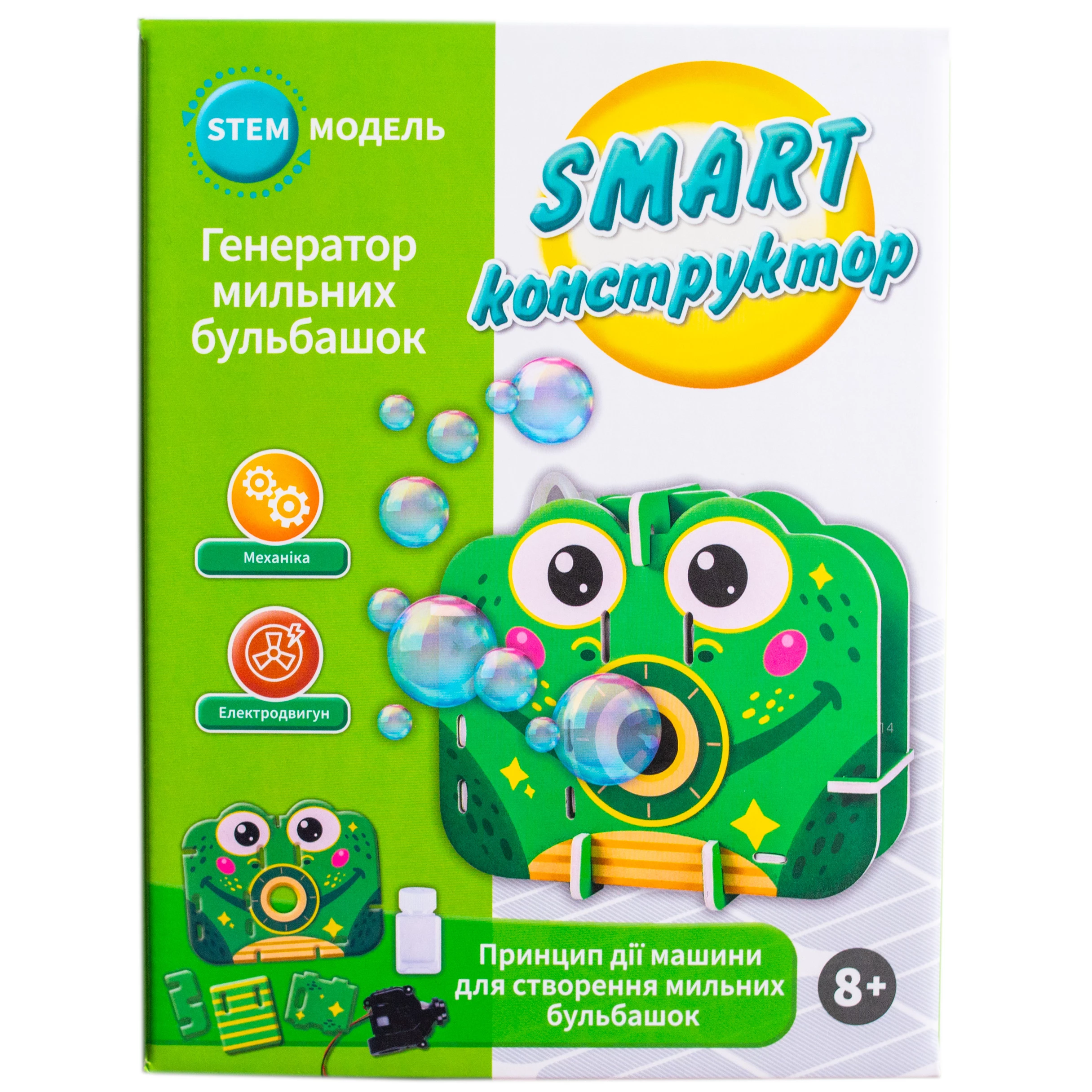 Познайомте дитину з основами інженерії через гру. Цей захопливий набір дозволяє зібрати працюючий пристрій та знайомить з основами механіки. Спостерігайте, як за допомогою електричного двигуна машина генерує мильні бульбашки. Набір включає все необхідне: міцний ламінований картон, пластикову ємність, а також блок для батарейок. Детальний покроковий посібник допомагає зібрати модель без труднощів і швидко побачити ефект.