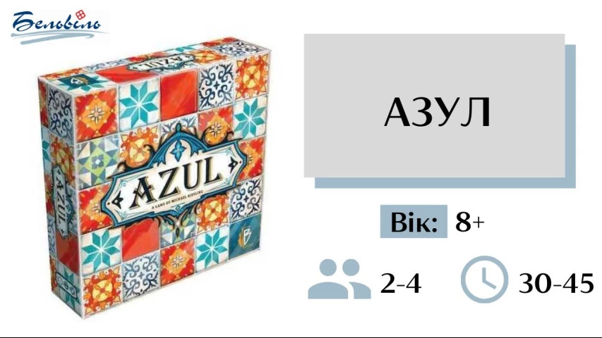 Настільна гра Azul — це красива логічна гра, в якій учасникам доведеться спробувати себе в ролі майстрів мозаїки та створити чудові візерунки та плитки. Ця стратегічна гра неодноразово відзначалася всілякими нагородами. Заповнюйте вашу виставкову дошку, заробляйте бали, розміщуйте плитки та створюйте візерунки.