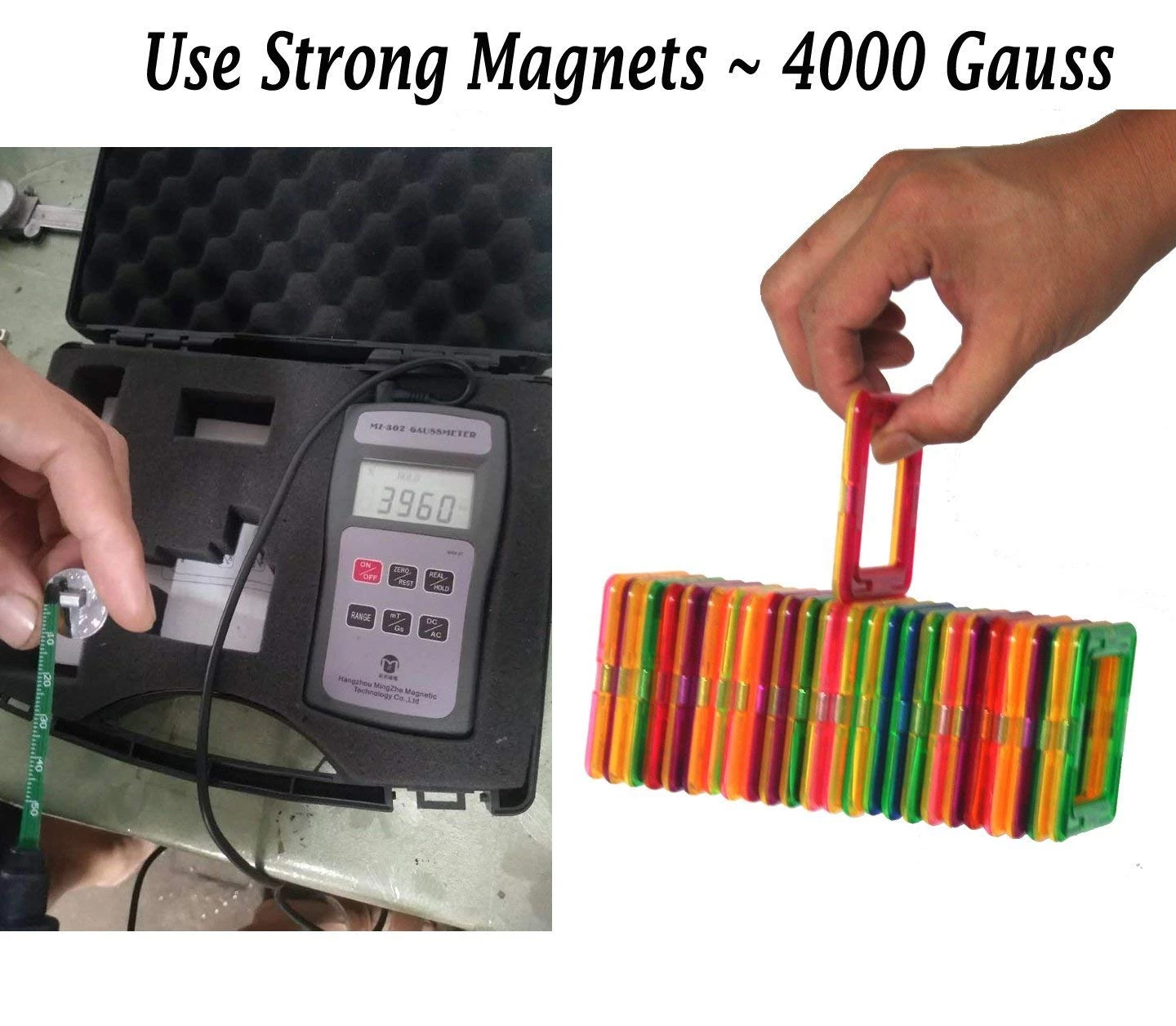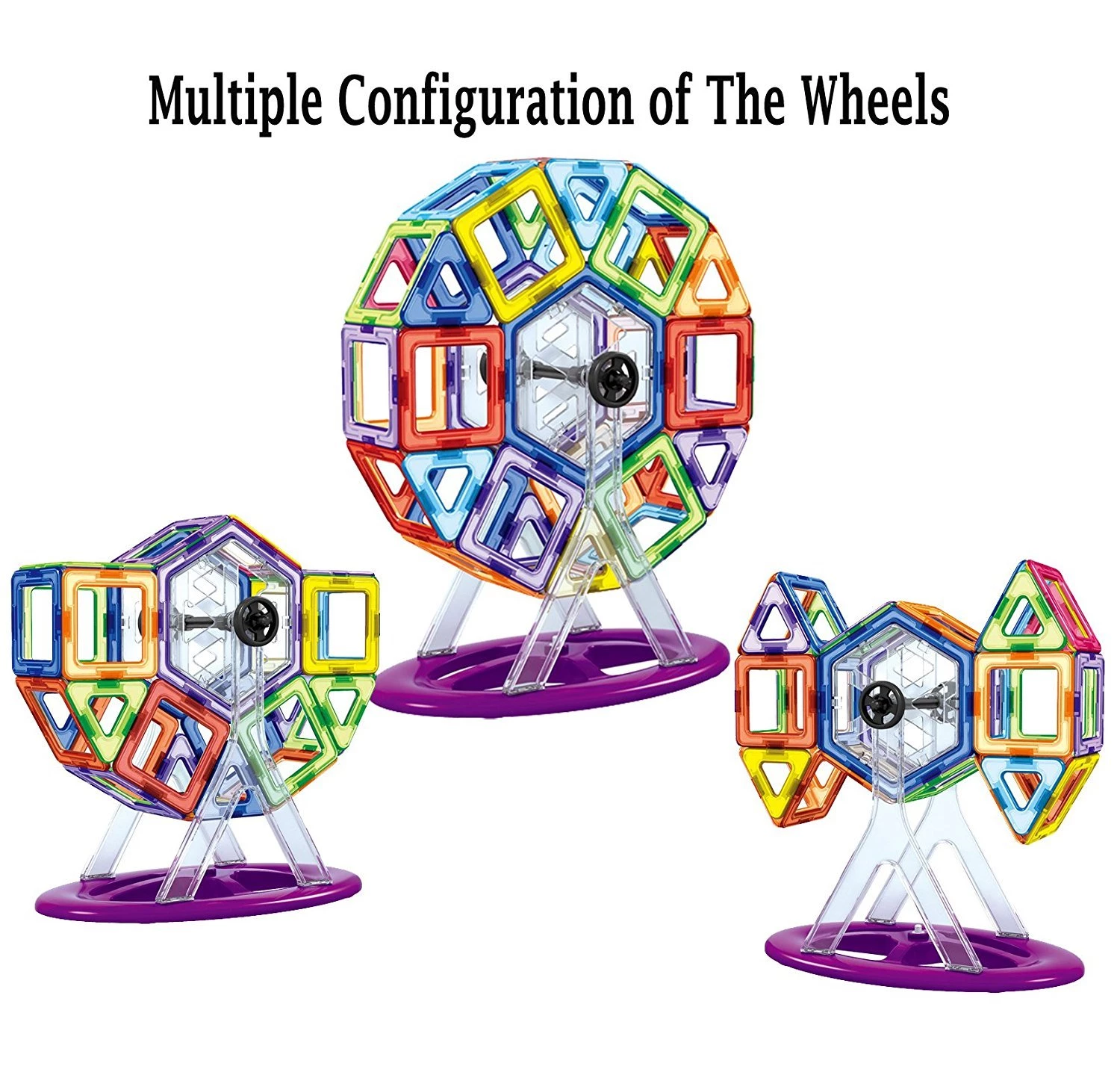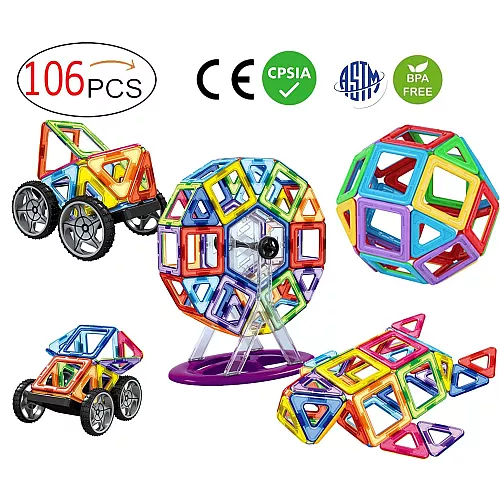 Цей набір включає в себе найбільш поширені фігури, які можна використовувати: квадрати, трикутники, довгий трикутник, шестикутник, півкола, прямокутники і колеса. Магнітні будівельні блоки стимулюють дітей до творчості, розвиваючи критичне мислення. Набір сертифікований ASTM, а також відповідає вимогам CSPIA. У всіх магнітних блоках використовується високоякісний оригінальний матеріал АБС, а різнокольорові деталі пройшли ультразвуковий процес для кращої герметичності, що ідеально запобігає розриву деталей.