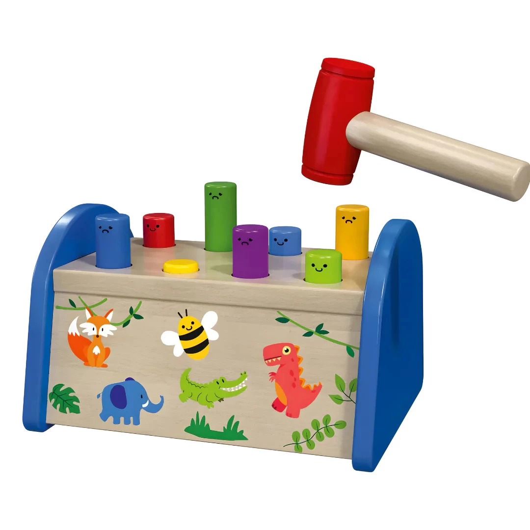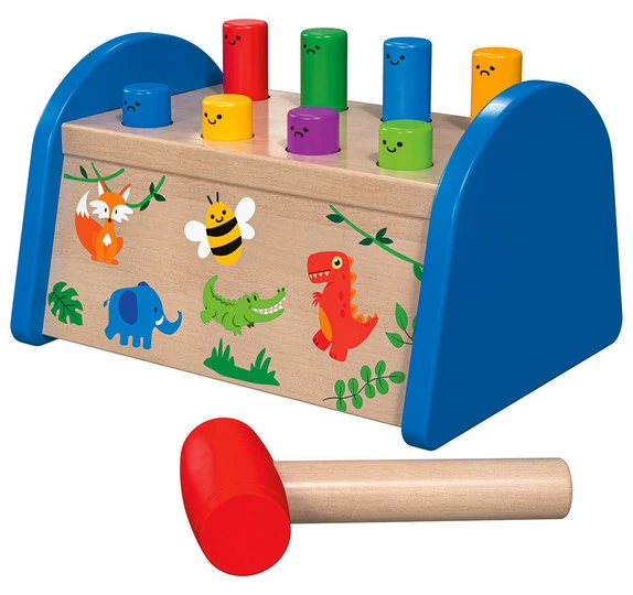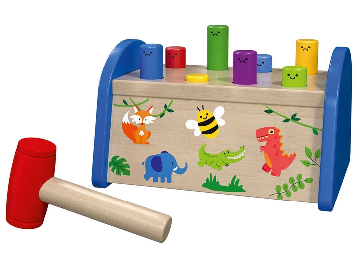 Ця іграшка стукалка підходить для дітей віком від року. Суть гри полягає у необхідності спеціальним молоточком забивати дерев'яні кілочки в отвори. Гра сприяє розвитку моторних навичок, а також допомагає виплеснути негативні емоції. Стукалка від Playtive допоможе малюкам навчитися правильно тримати в руках молоточок та забивати цвяхи.