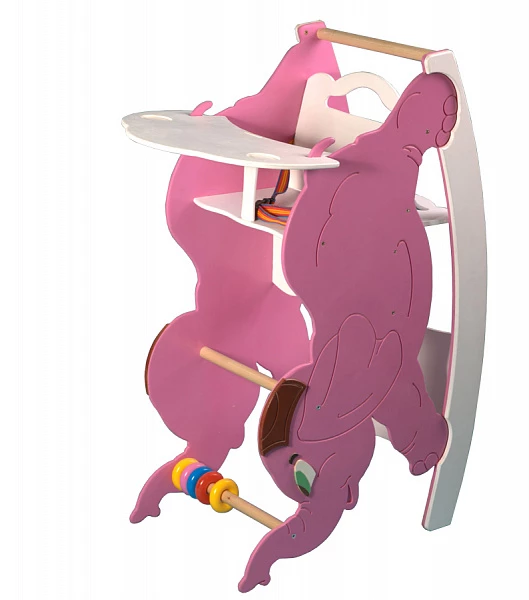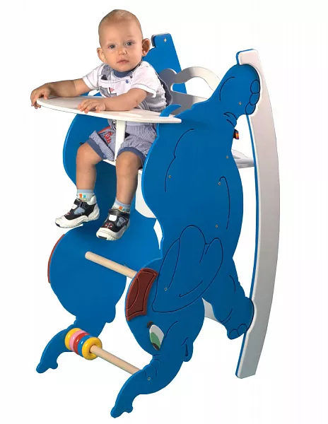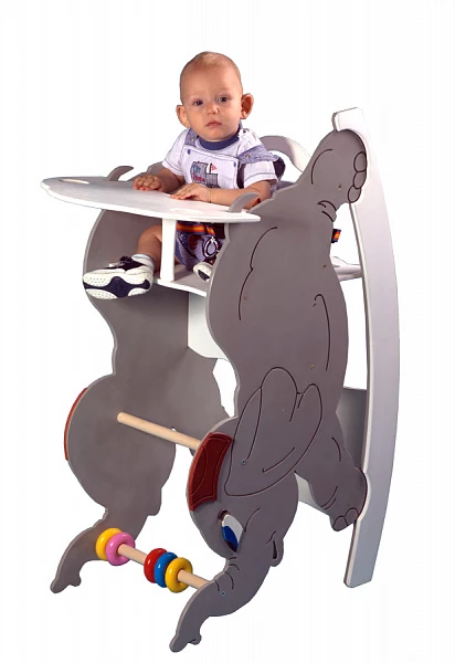 Універсальний стілець для годування малюка, із зручним кріслом-гойдалкою і столом. Це унікальне надбання, яке зможе замінити відразу кілька пристосувань. Цей цікавий і смішний слоник, у вигляді якого зроблено це крісло, стане незмінним атрибутом кімнати дитини. Завдяки своїй оригінальності, батьки відразу зможуть отримати стілець для прийому їжі, гойдалку і стіл для підростаючої дитини. З ним можна без особливих труднощів нагодувати малюка і зробити це швидко. Він створений з дотриманням усіх фізіологічних особливостей раннього та дошкільного розвитку дітей. Також він зможе витримати навантаження до 20 кілограм.