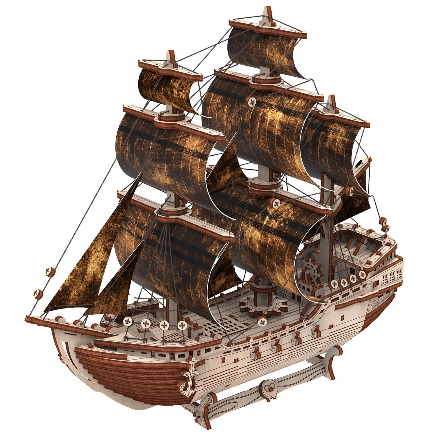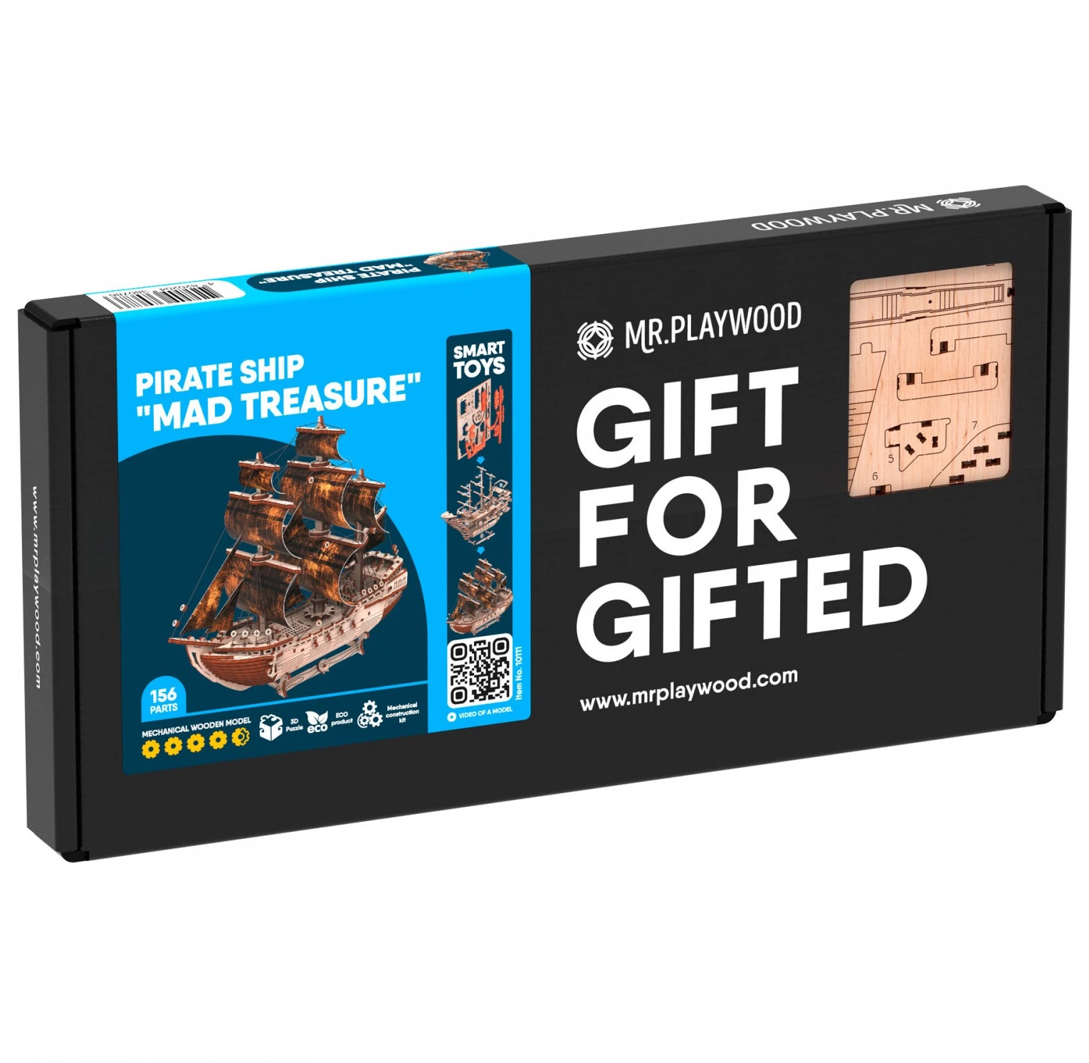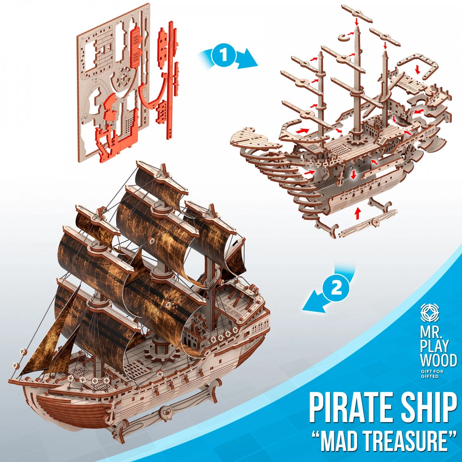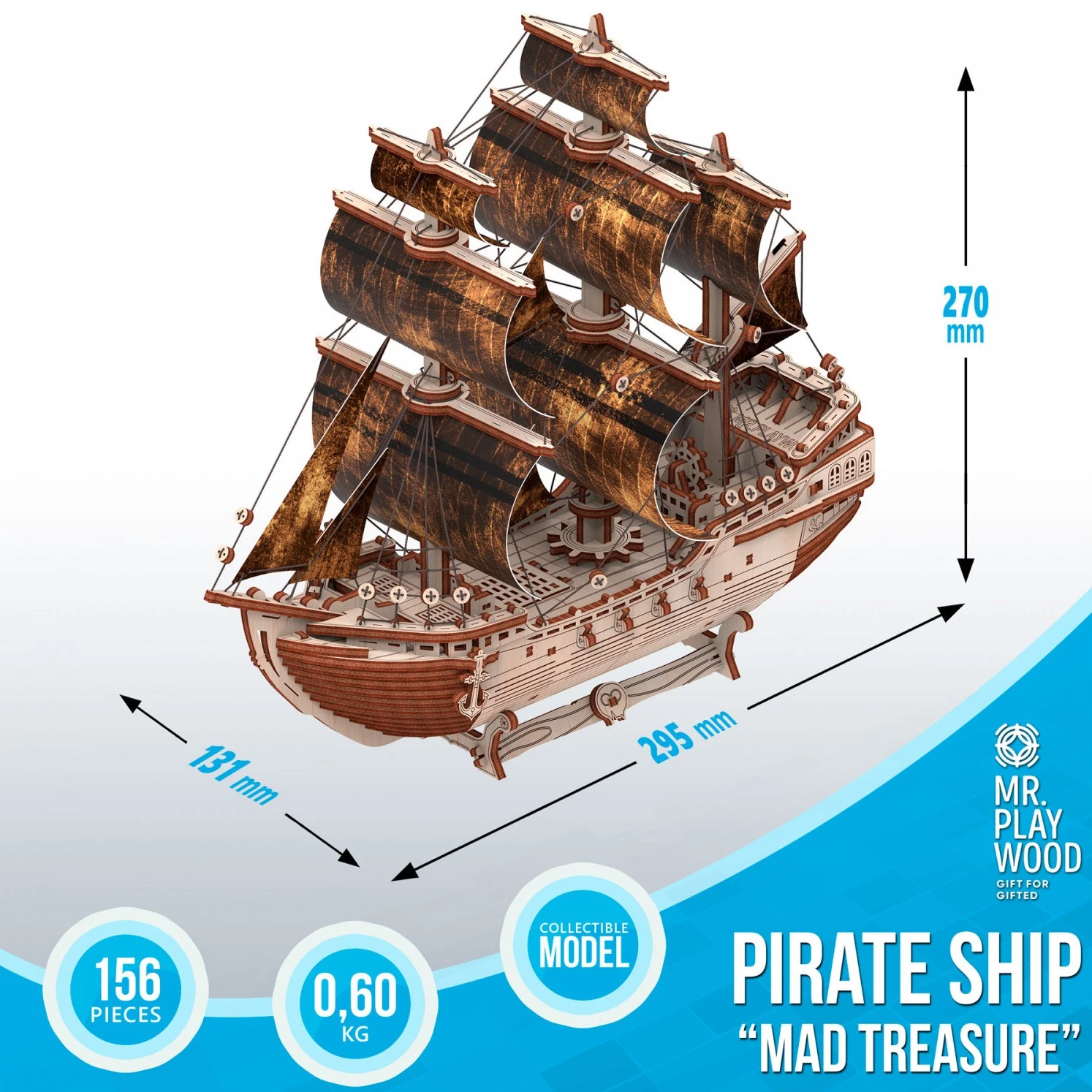 Цей захопливий тривимірний механічний конструктор включає дерев'яні деталі для складання моделі грізного піратського судна з назвою «Божевільні скарби». Механічний конструктор, поза всяким сумнівом, стане улюбленою іграшкою кожного хлопчика, який мріє про морські пригоди і любить книги чи кінофільми на піратську тематику.
