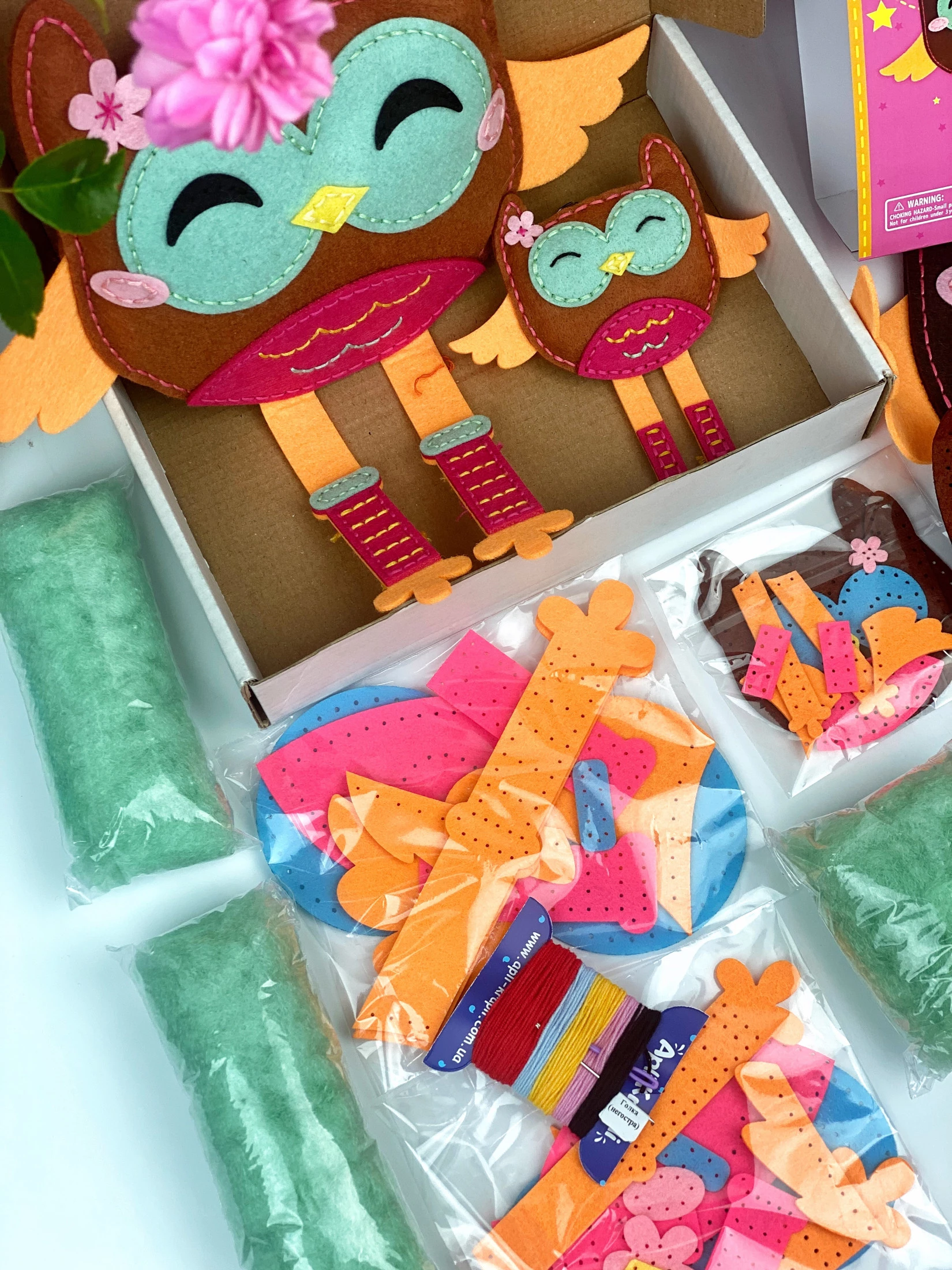 Набір для творчості створений для навчання через гру за мотивами методики Монтессорі. Він включає готові фетрові деталі для шиття, різнокольорові нитки, безпечну голку та інструкцію.