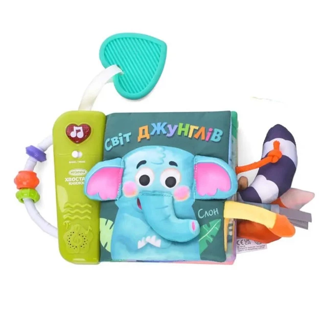 Книжка-іграшка оснащена прорізувачем для зубів, пискалкою, шорсткими сторінками та безпечним дзеркальцем.