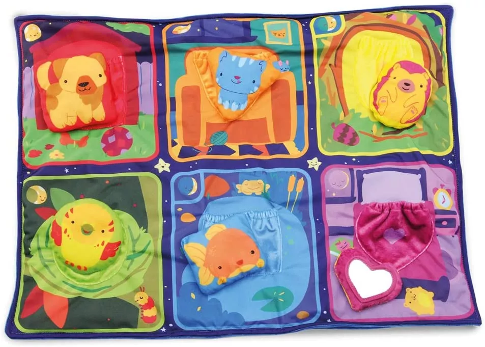 Яскрава ковдра з 6 кишенями і 6 плюшевими тваринами сподобається всім малюкам. На ньому зображені різні персонажі, яких необхідно укласти в свої ліжечка. Є збірник цікавих розповідей, віршів і завдань, для читання діткам перед сном. Прочитайте розповідь, а потім покладіть тварин в їх «ліжка». Як тільки кожен герой виявиться під своїм одеялком, значить і дитині пора йти спати. Покривало дуже приємне на дотик. З ним можна перетворити засипання в корисну і цікаву гру.